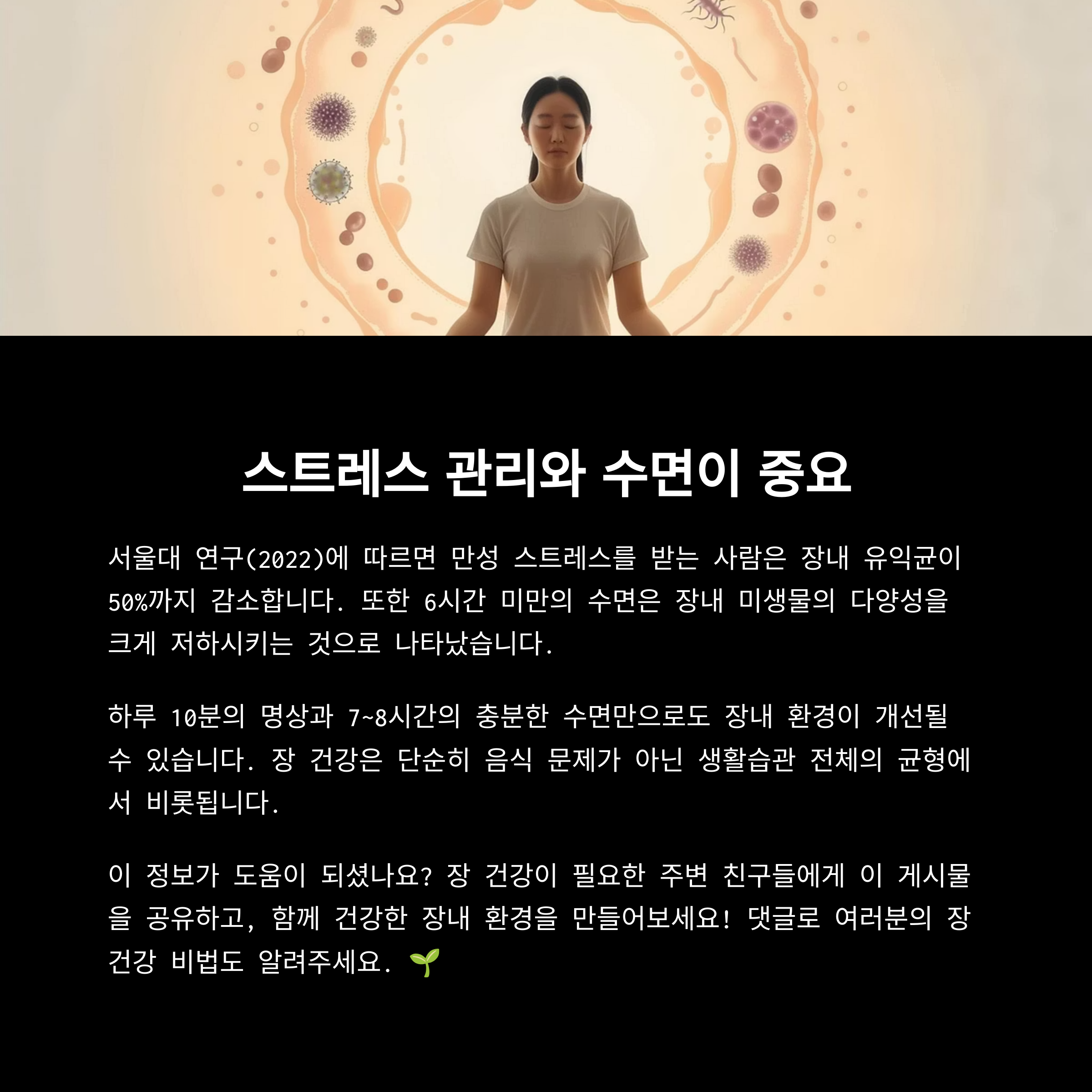 스트레스는 장내 균형을 무너뜨리고, 수면 부족은 장 점막 회복을 방해합니다.