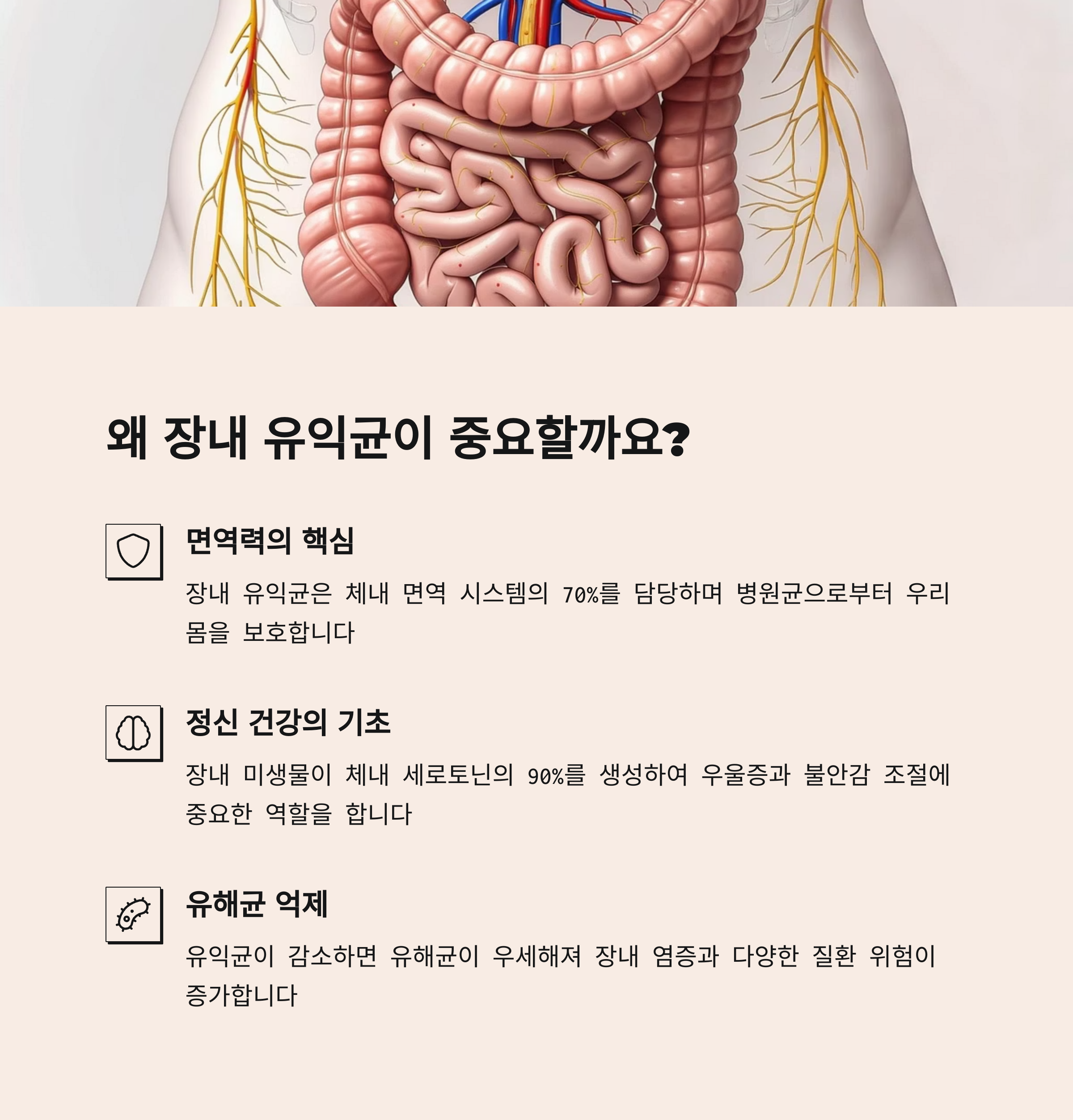 장내 유익균은 소화 흡수, 면역력 강화, 염증 조절 등 전신 건강에 필수적인 역할을 합니다.
