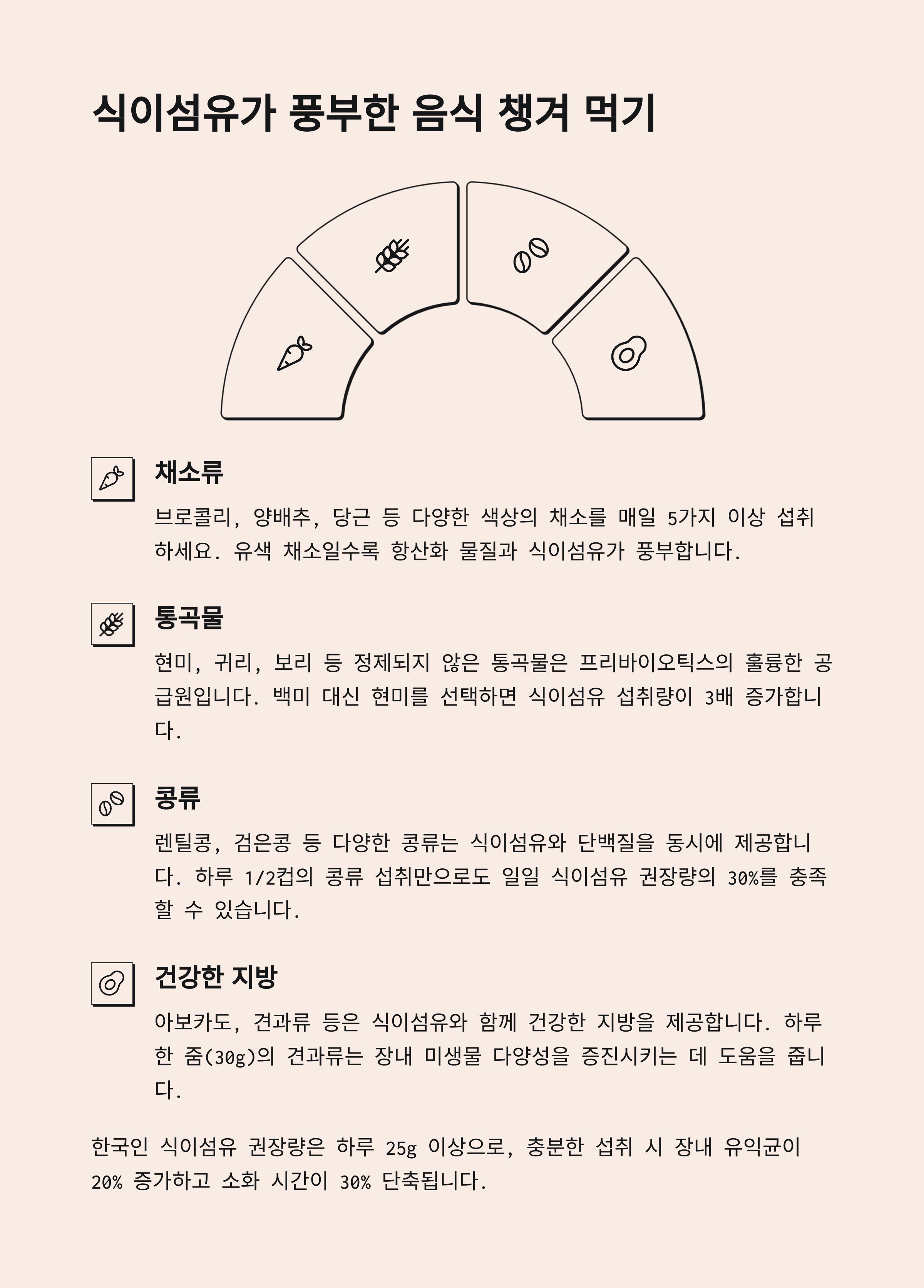 "식이섬유는 유익균의 성장 환경을 조성하고 장운동을 촉진합니다."