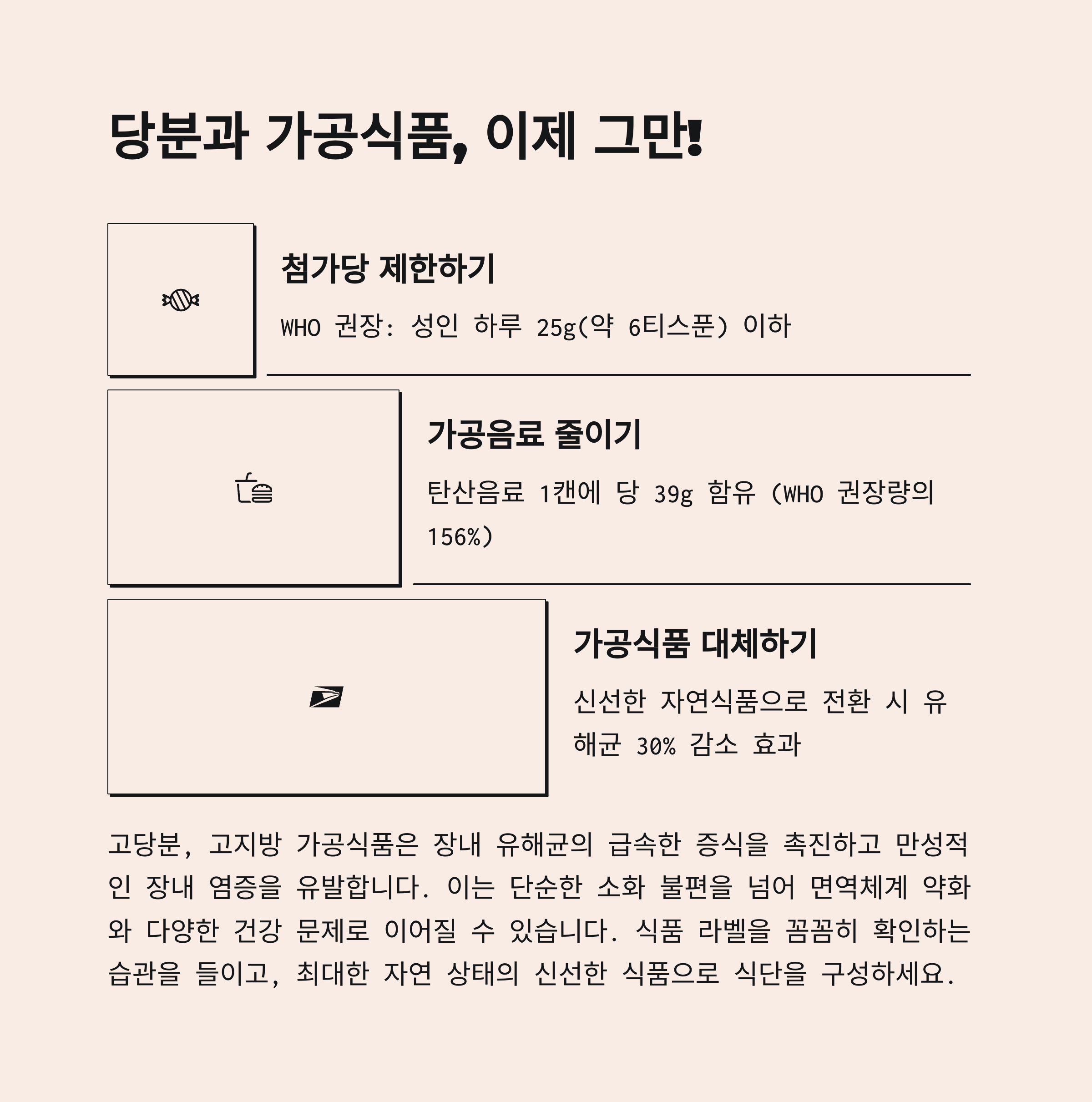 설탕, 가공식품, 인공첨가물은 유해균을 늘리고 장내 환경을 악화시킵니다.