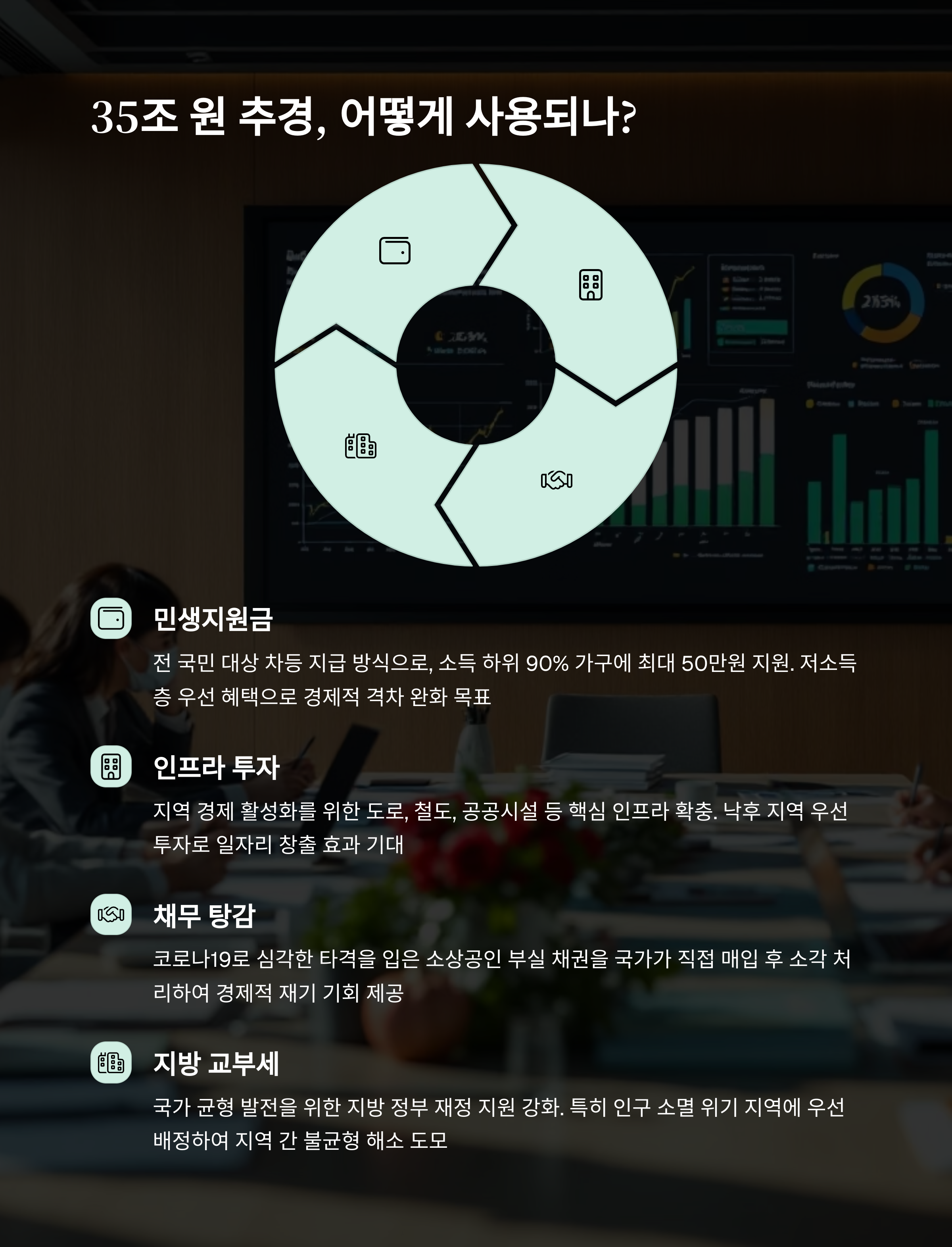 이번 추경은 총 35조 원 규모로, 전 국민 대상의 민생회복지원금 지급과 함께