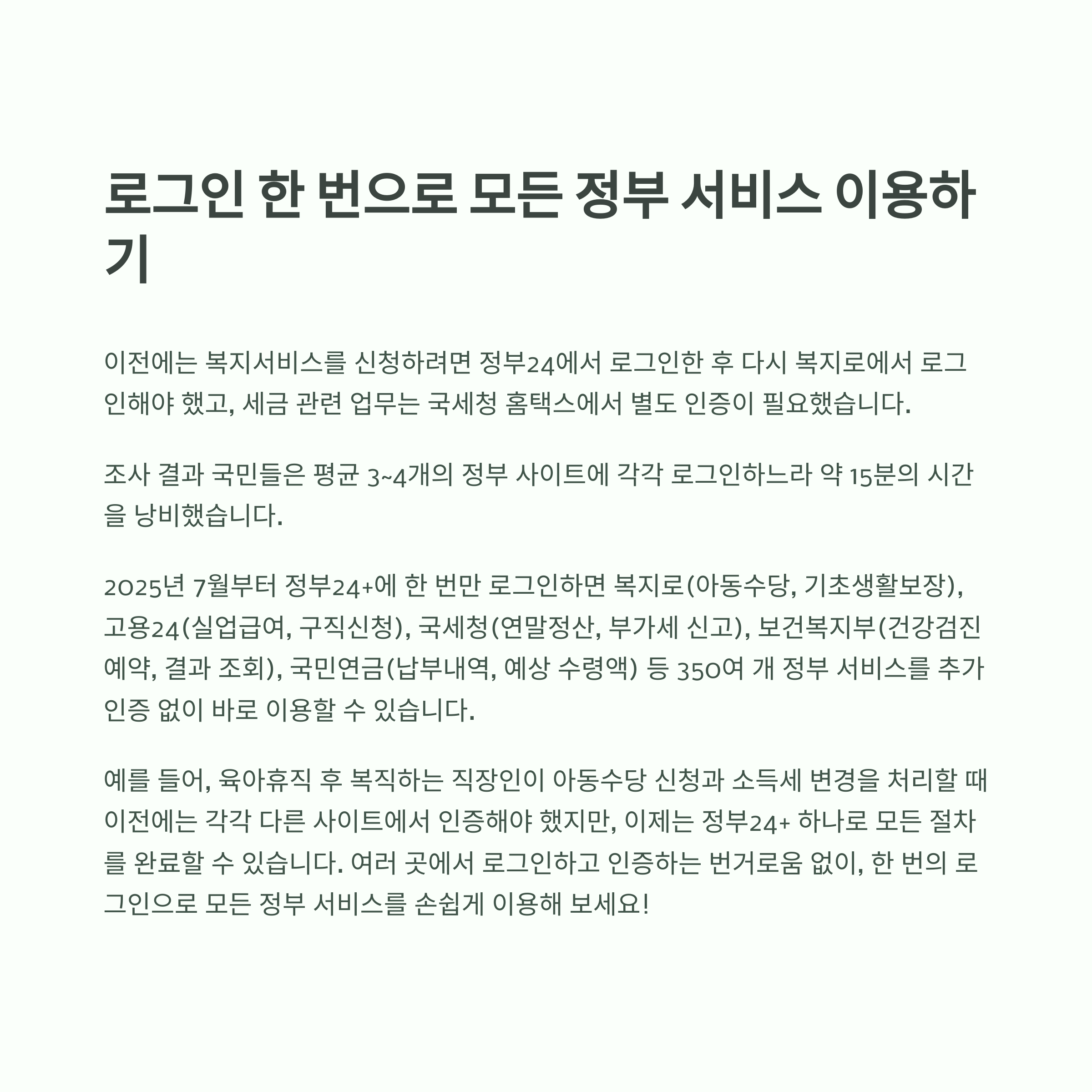 하지만 이제는 정부24+ 로그인만으로 복지 서비스 신청도 한 번에 되는 거예요.