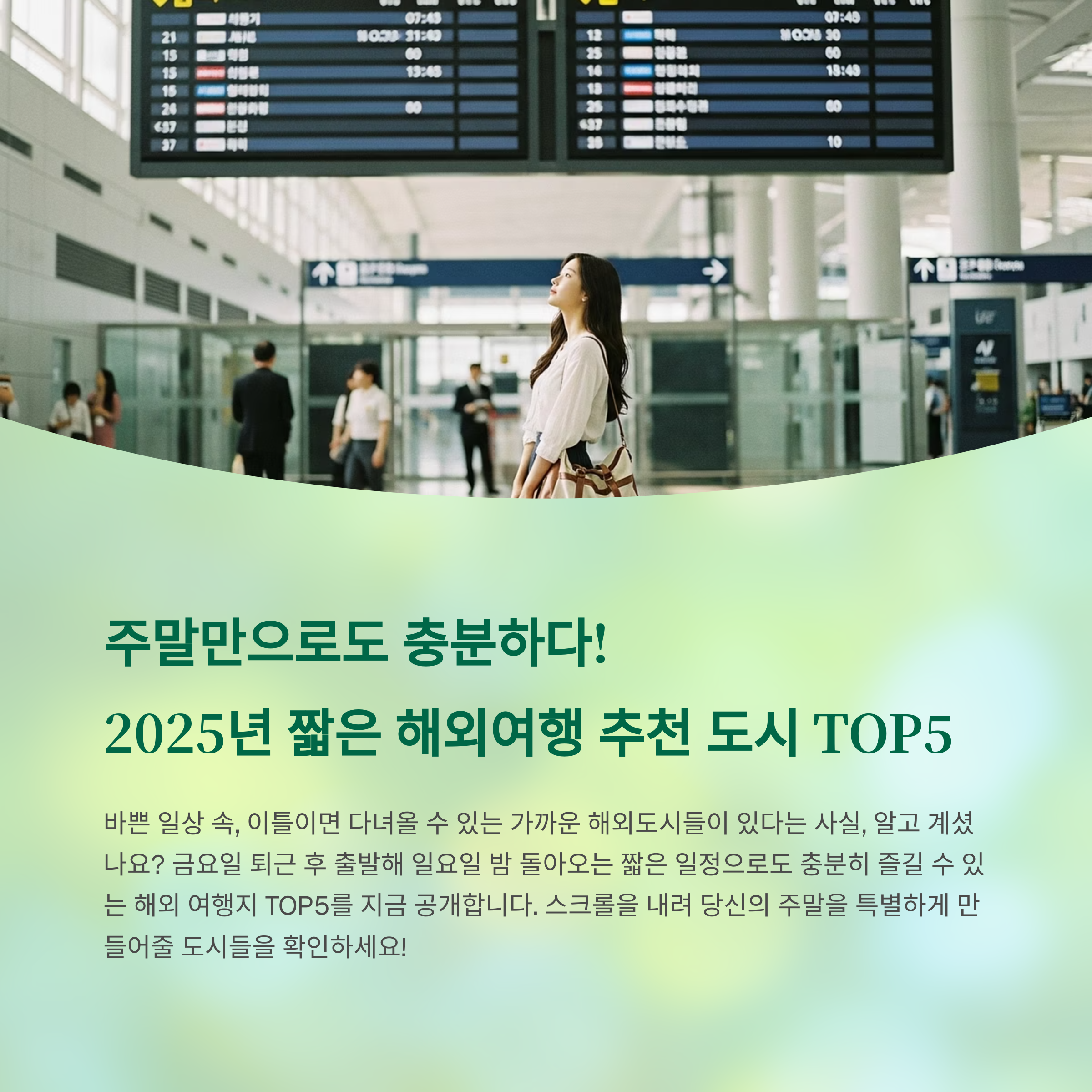 2025년 최신 트렌드와 함께, 짧은 일정에도 후회 없는 다섯 곳을 선정해 여정 팁·항공 정보까지 모두 정리했어요.