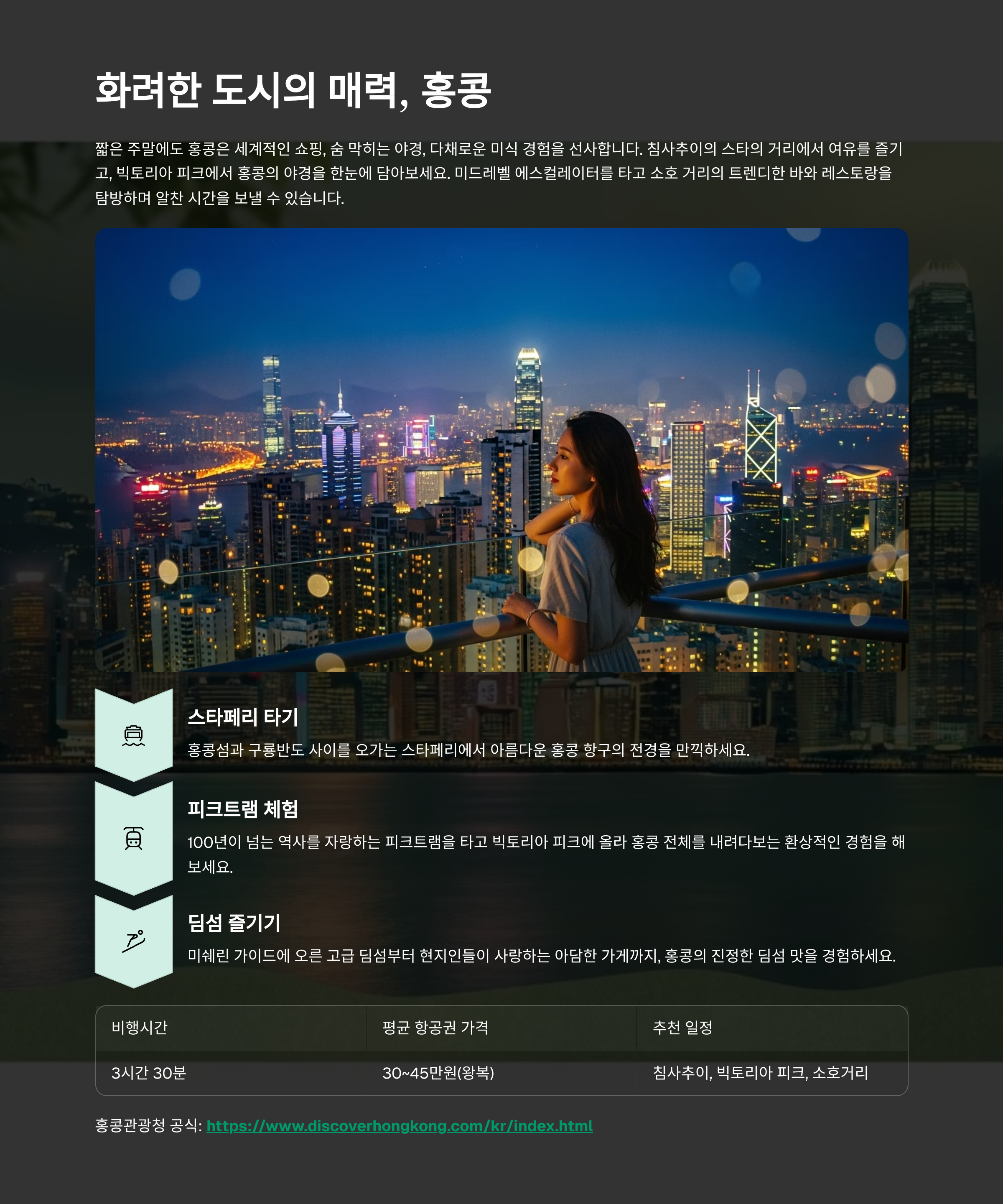 홍콩은 세계적인 쇼핑과 야경, 먹거리 모두를 단기간에 경험할 수 있는 도시예요 침사추이 스타의 거리 산책, 빅토리아 피크 전망대, 미드레벨 에스컬레이터와 현지 딤섬 투어까지 시간이 짧아도 알차게 보낼 수 있습니다