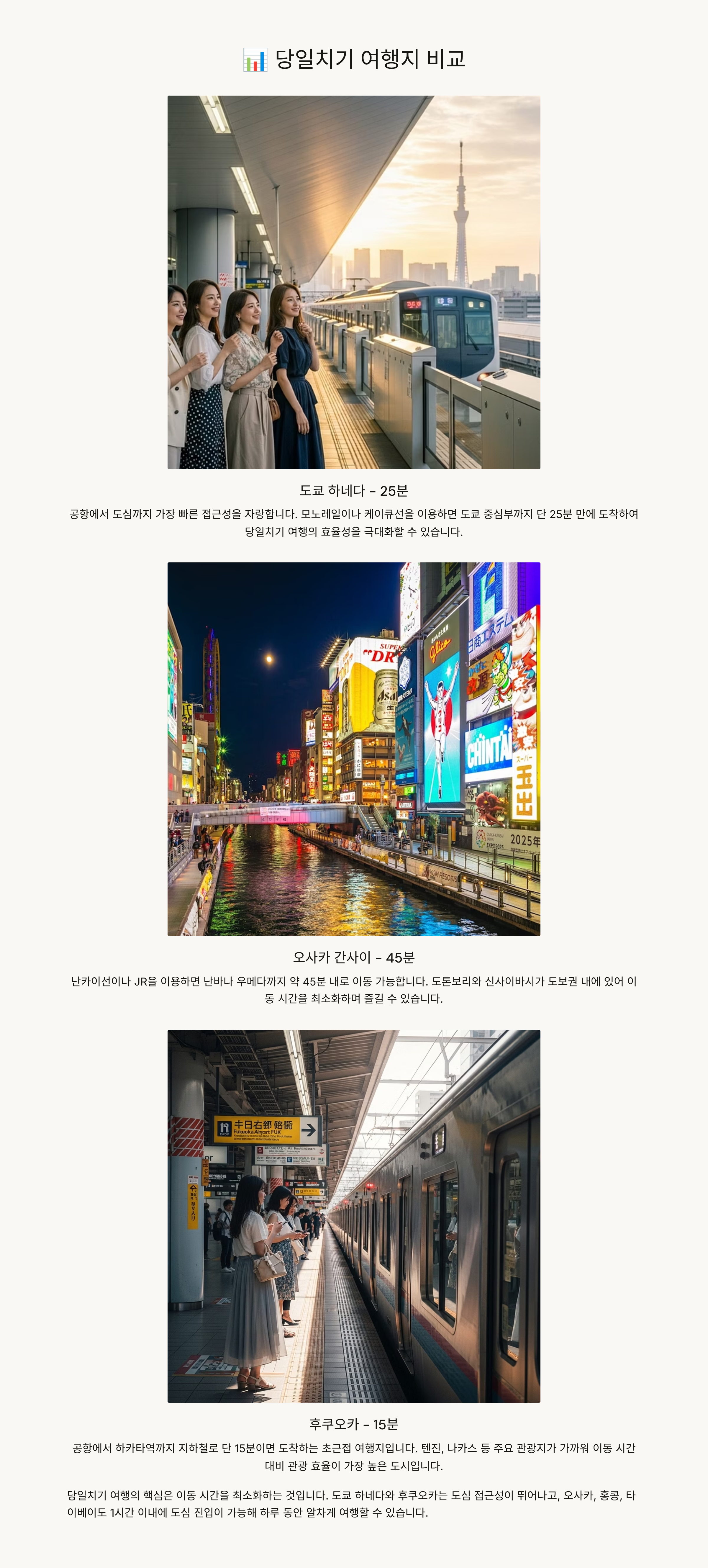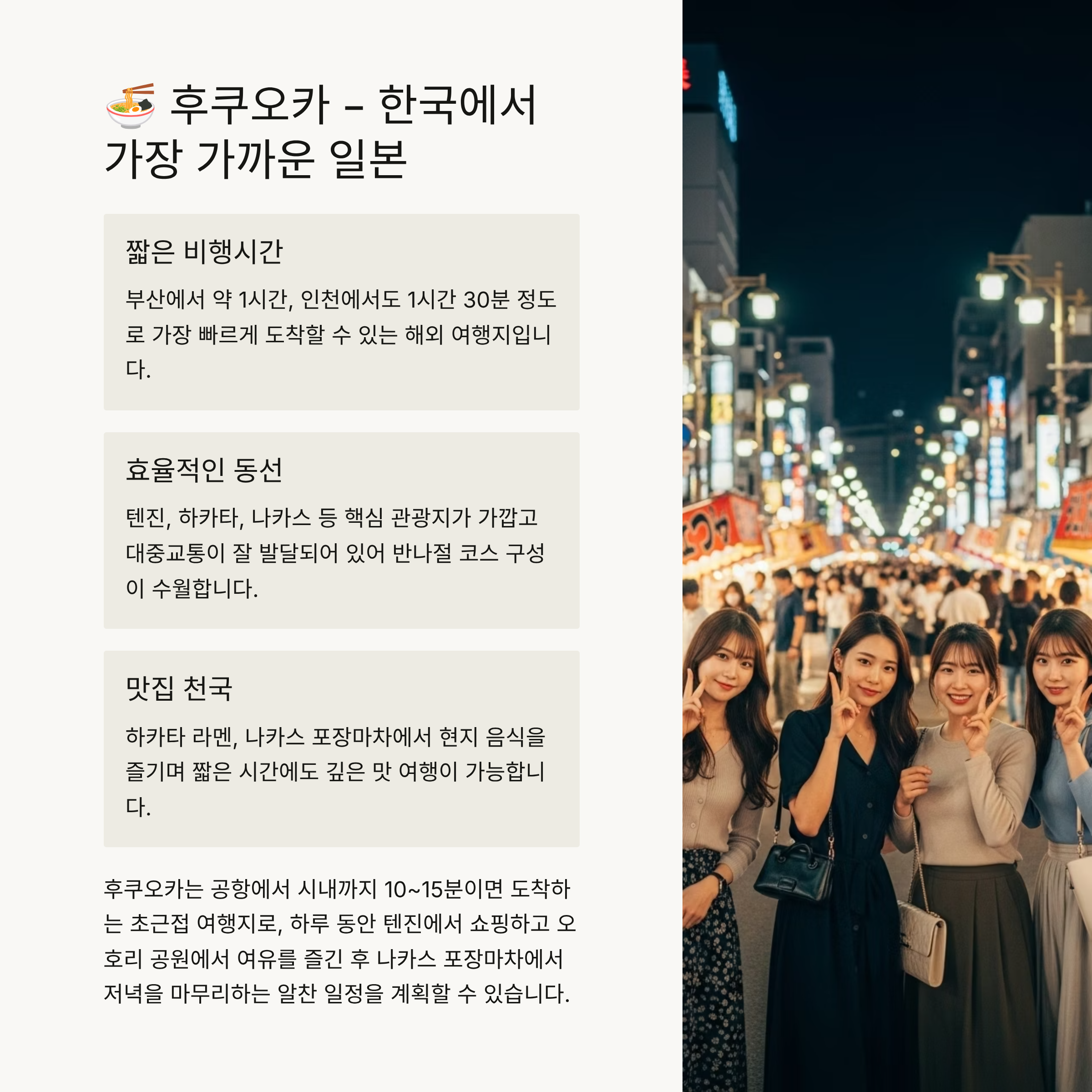 | 후쿠오카 | 10~15분 | 초근접, 라멘·쇼핑 |