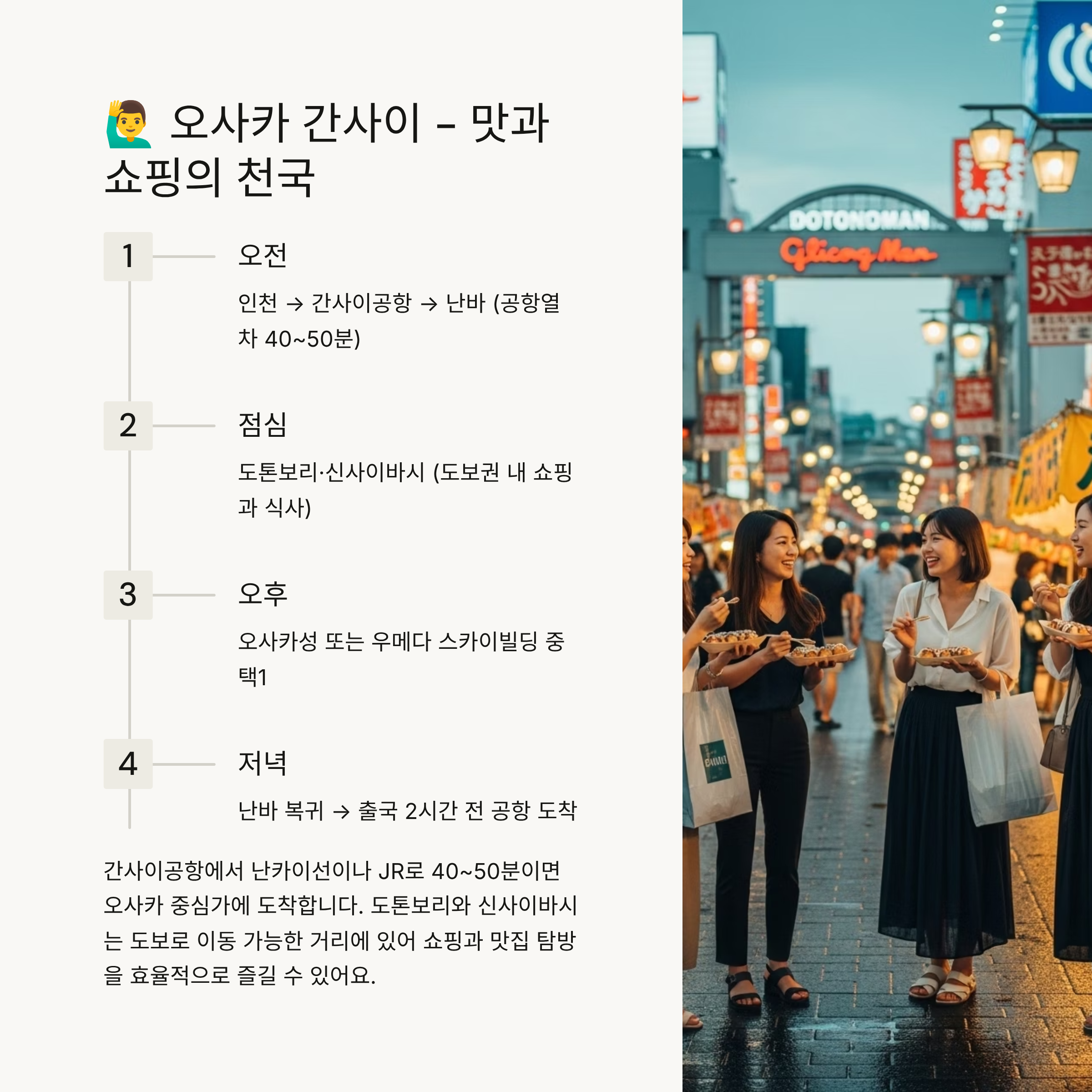 간사이공항에서 난카이/JR로 난바·우메다 40~50분대. 도톤보리·신사이바시 도보권에 핵심이 모여 있어 동선 효율이 높습니다.