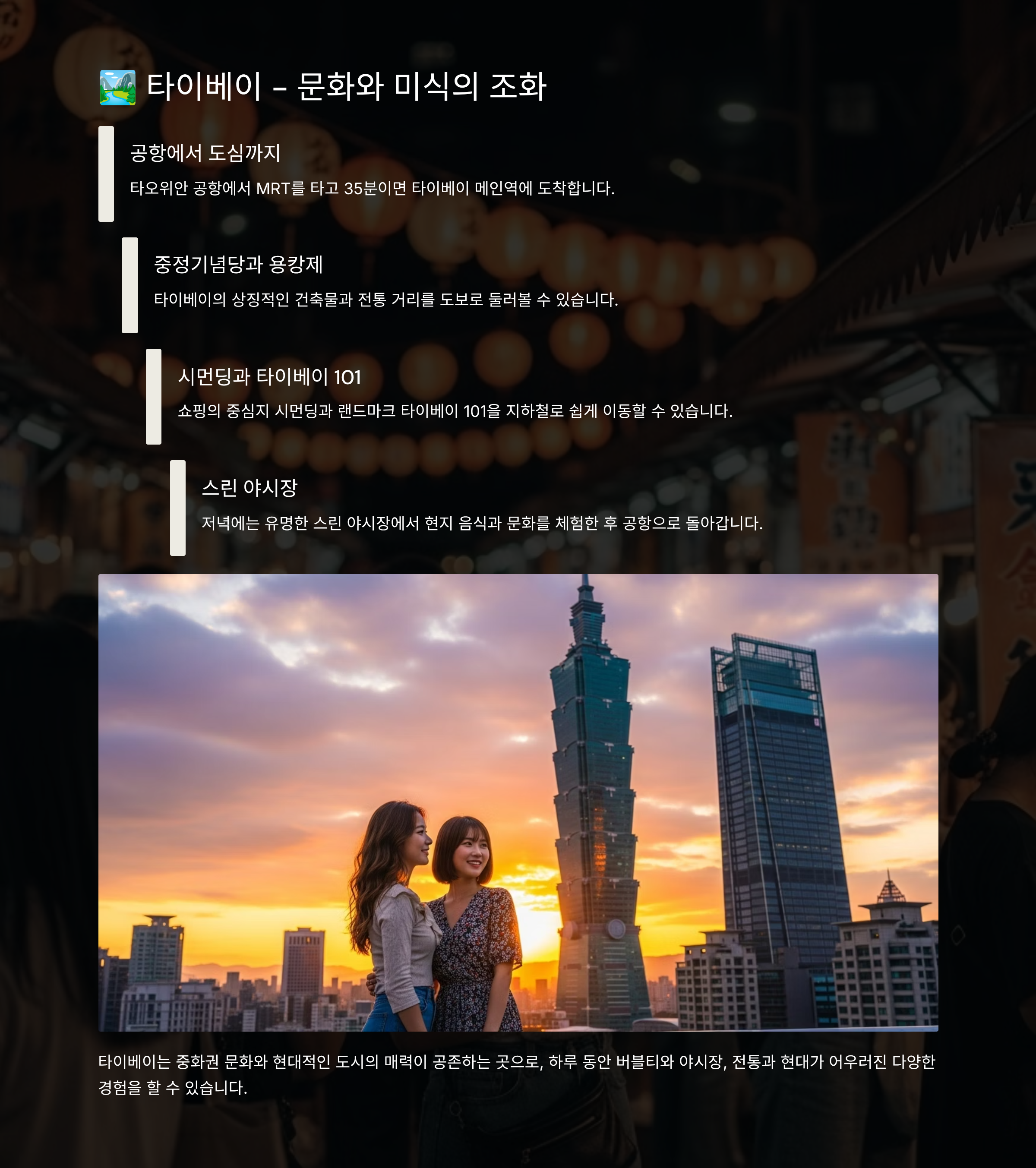 타오위안 공항 MRT로 35분 내 타이베이 메인역 진입. 버블티·야시장·중정기념당 등 핵심 포인트 압축 가능.