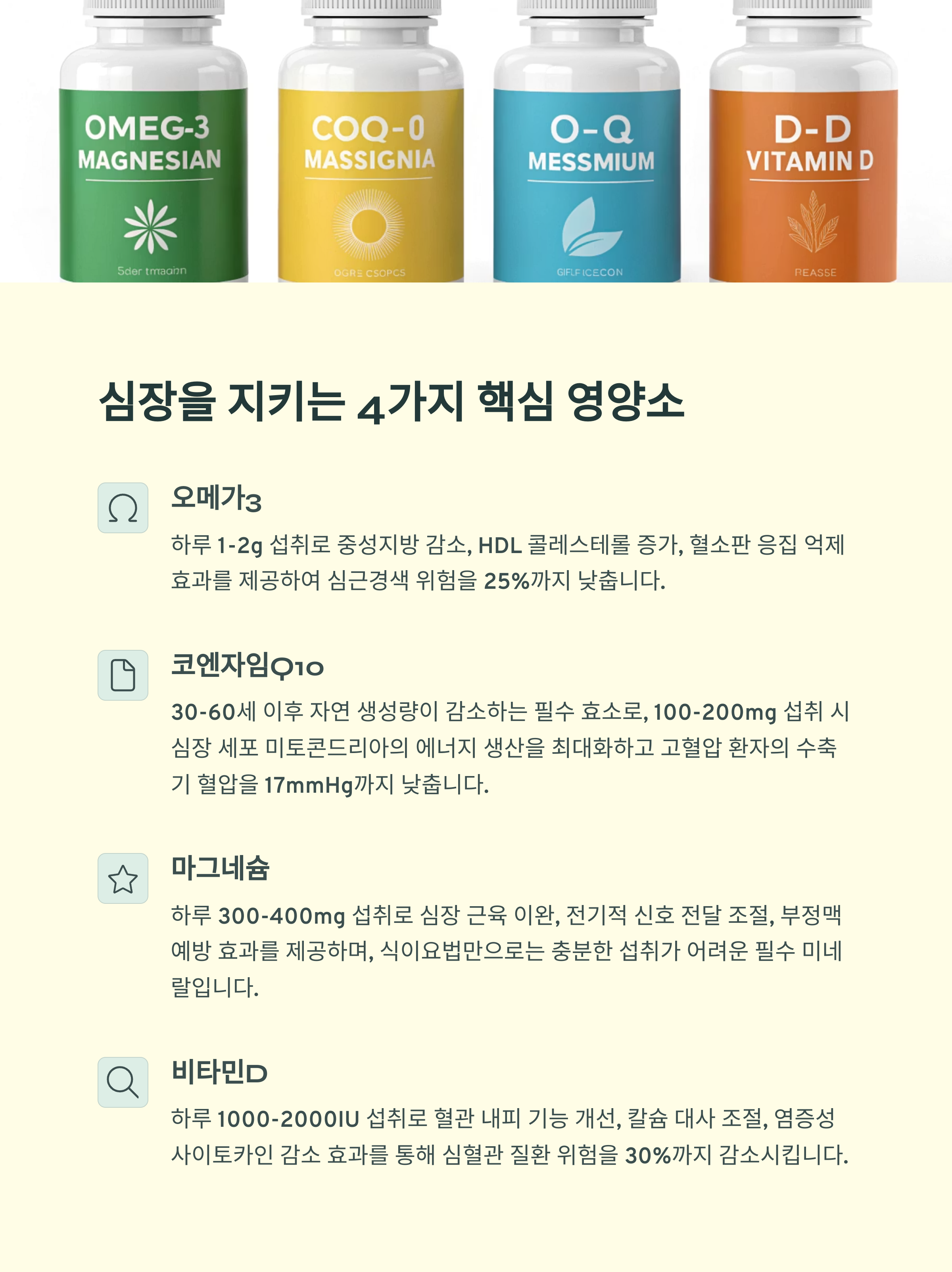 "오메가3 지방산, 코엔자임Q10, 마그네슘, 비타민D 등은 심혈관 기능 강화에 직접적인 도움을 줍니다."
