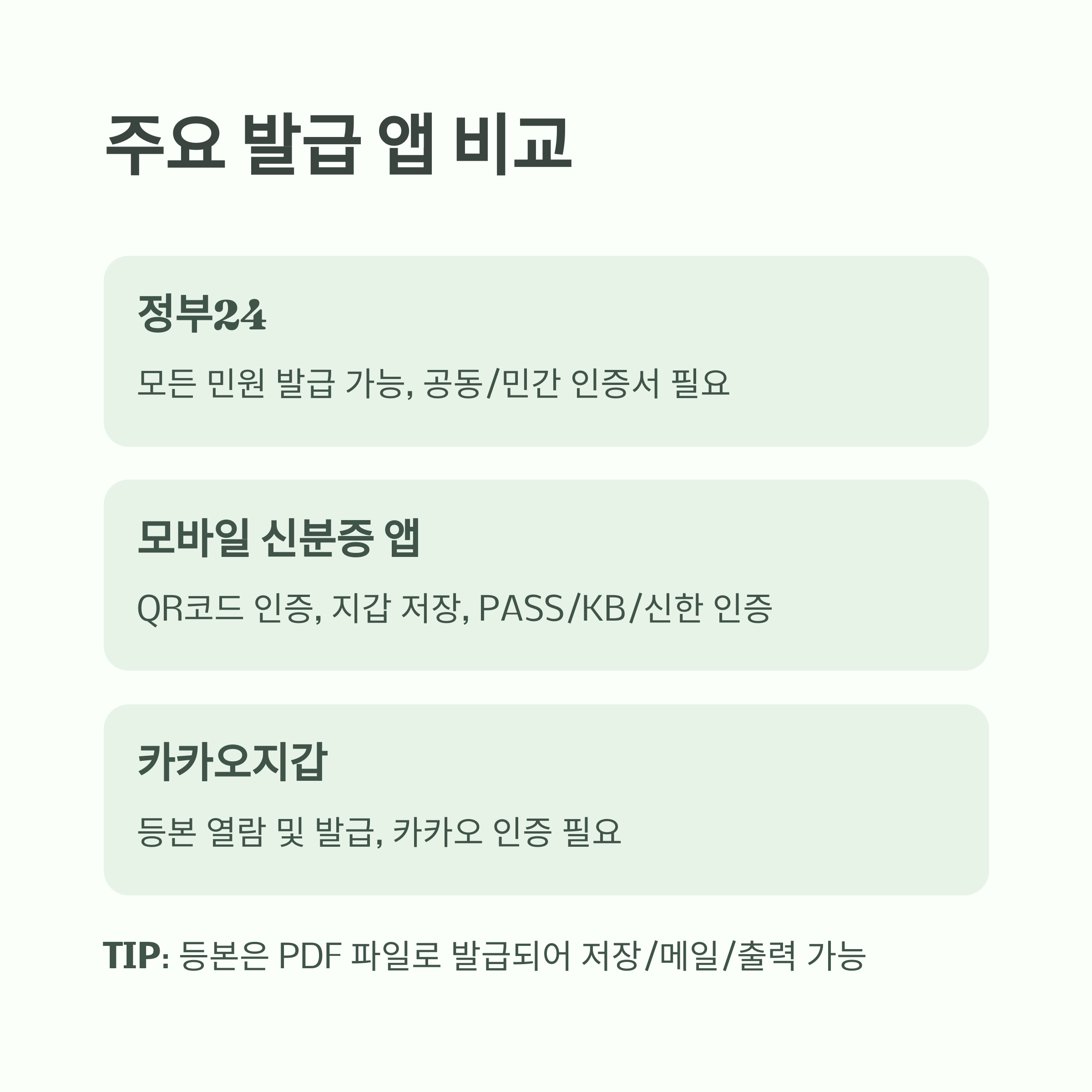 | 카카오지갑 (카카오 인증) | 등본 열람 및 발급 지원 | 카카오 인증 + 본인 명의 기기 |