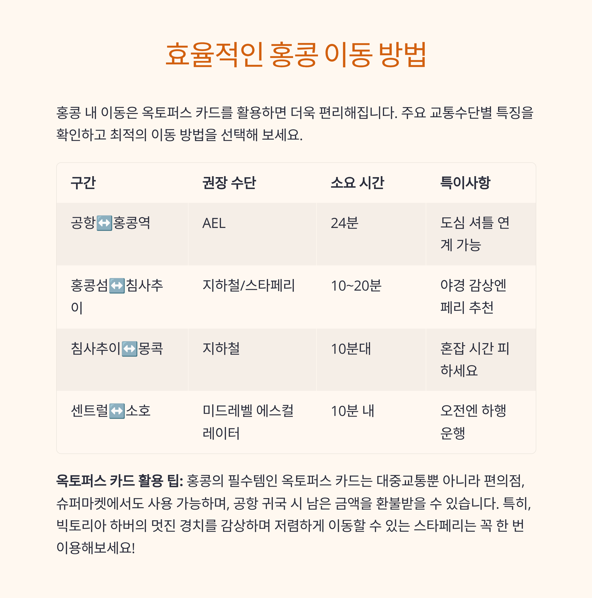 | 공항버스(A21 등) | 침사추이·몽콕 | 45~70분 | HK$30대 | 가성비, 숙소 인근 정류장 |