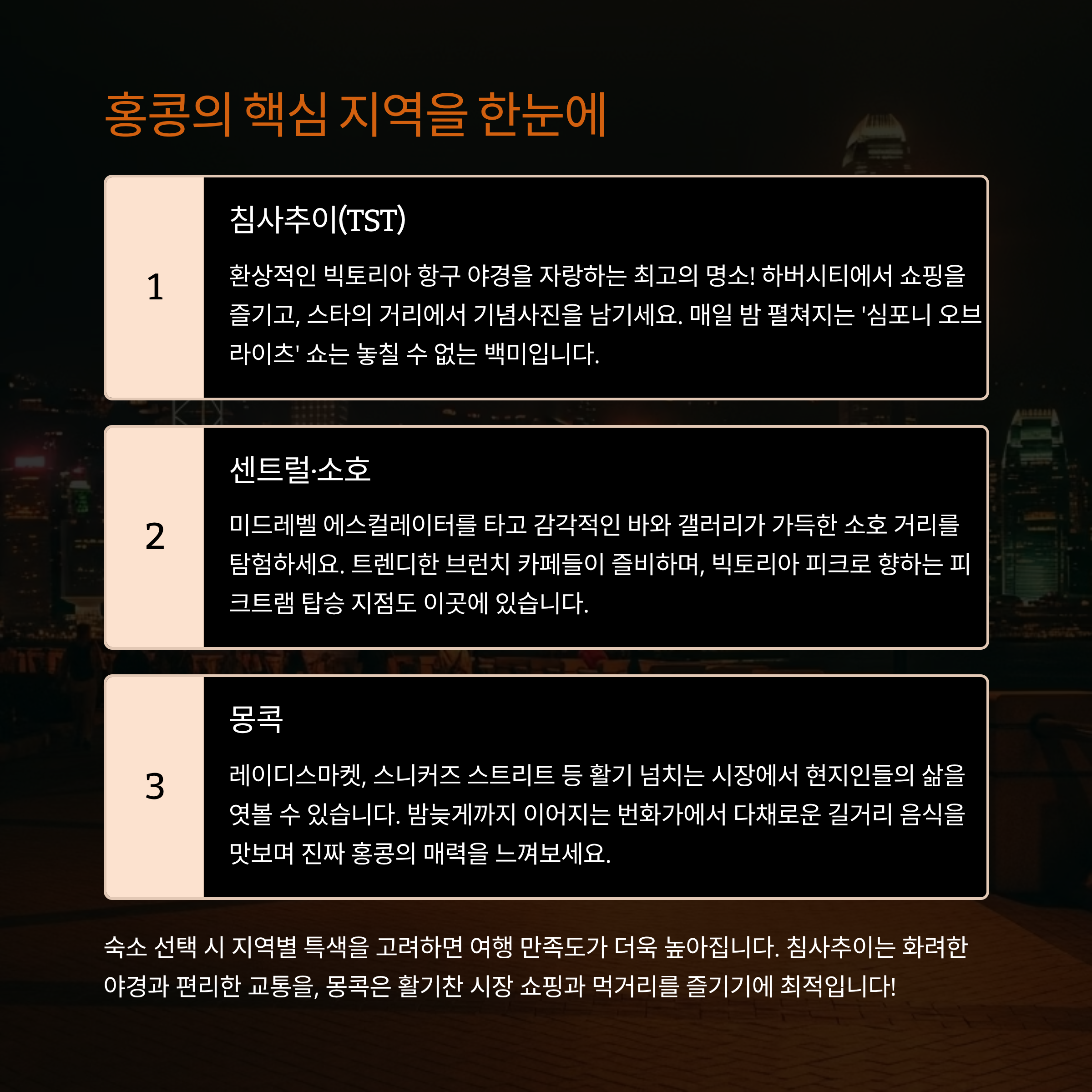 핵심 지역 한눈에: 침사추이·센트럴·몽콕