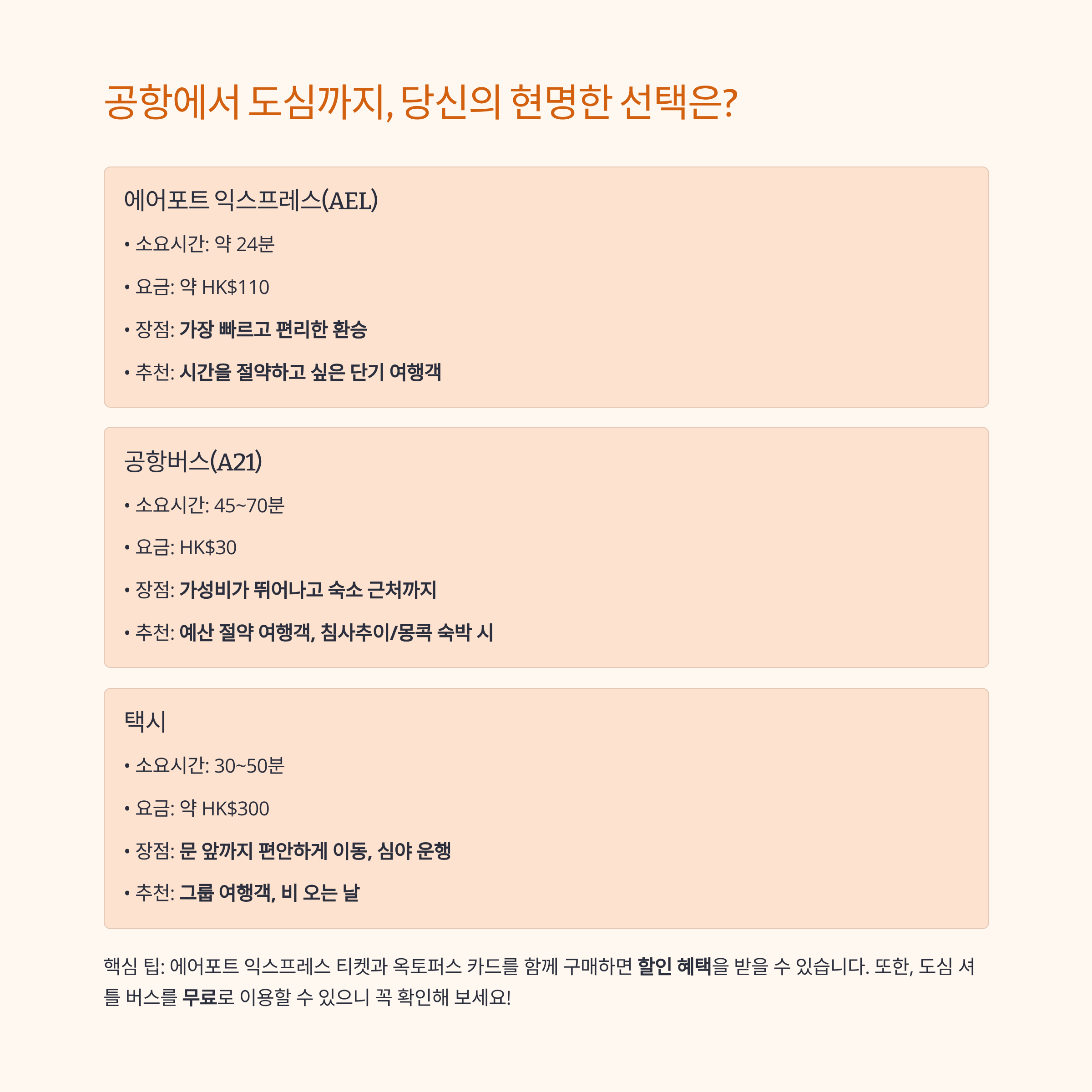 | 공항↔홍콩역 | AEL | 24분 | 낮음 | 도심 셔틀(노선 변동 확인) |