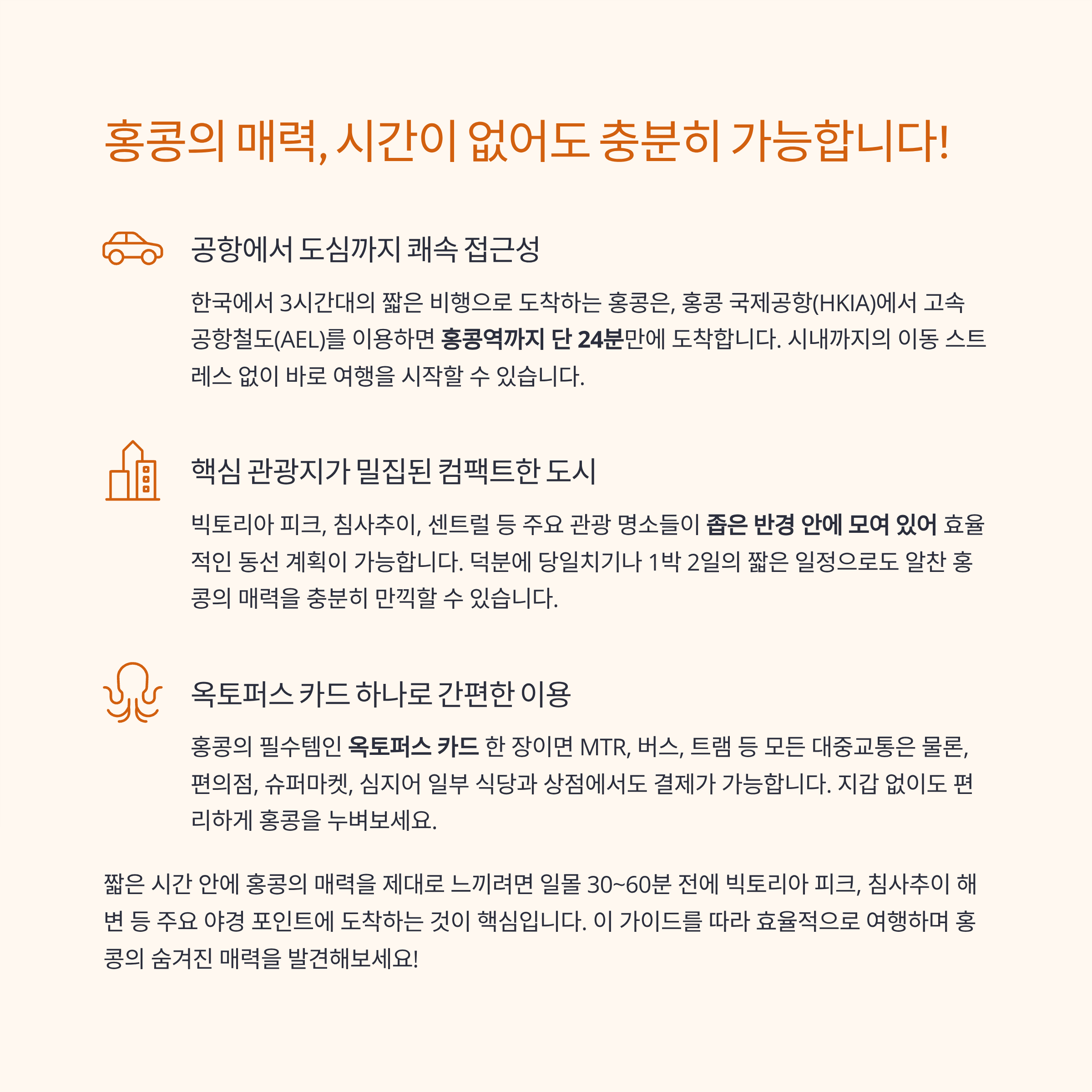 홍콩은 3시간대 비행, 공항철도(AEL) 24분 도심 진입으로 이동 스트레스가 낮은 도시입니다. 야경·미식·쇼핑이 가까운 반경에 모여 있어 당일치기·1박2일 같은 짧은 일정도 밀도 있게 즐길 수 있습니다.