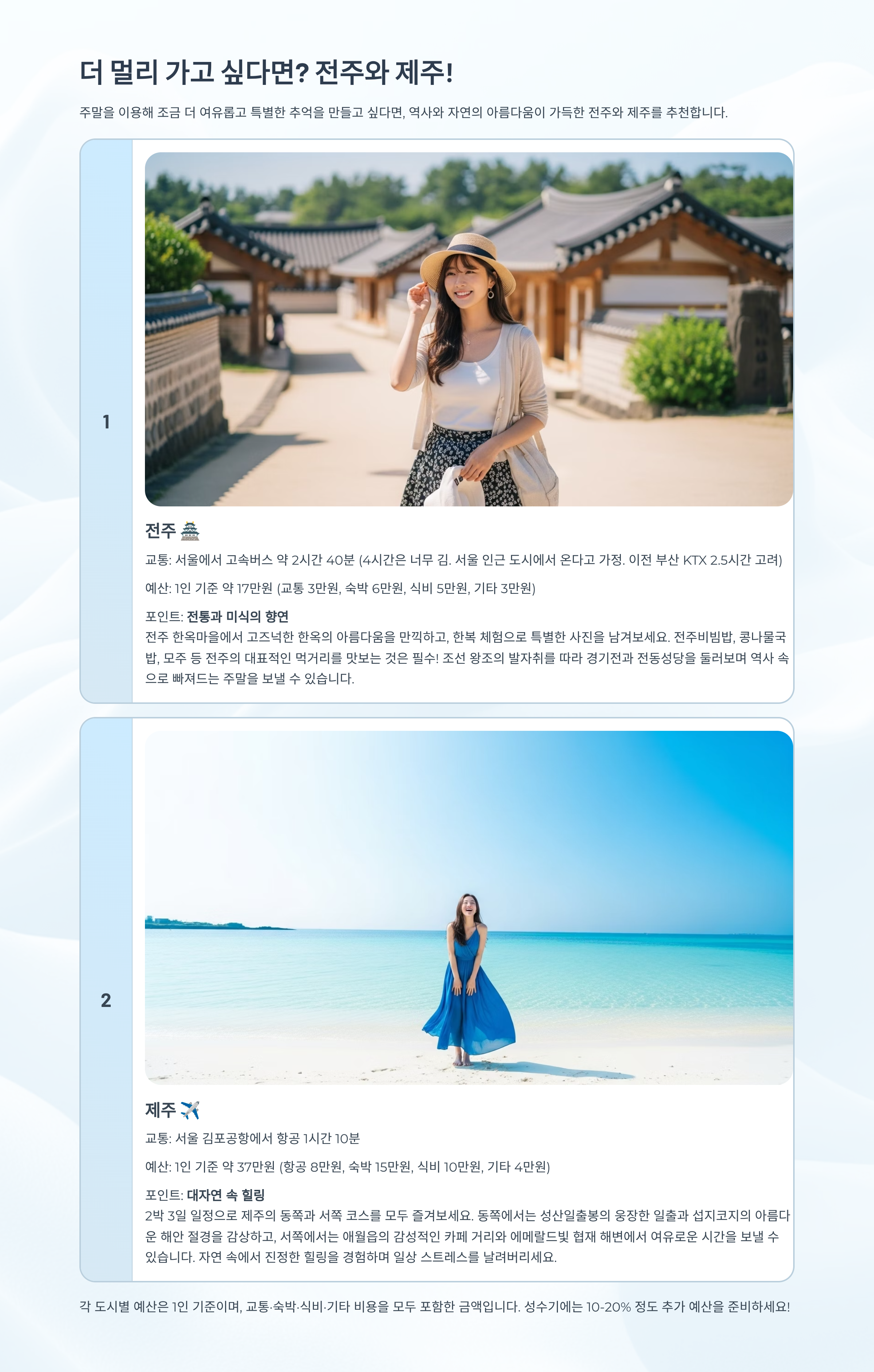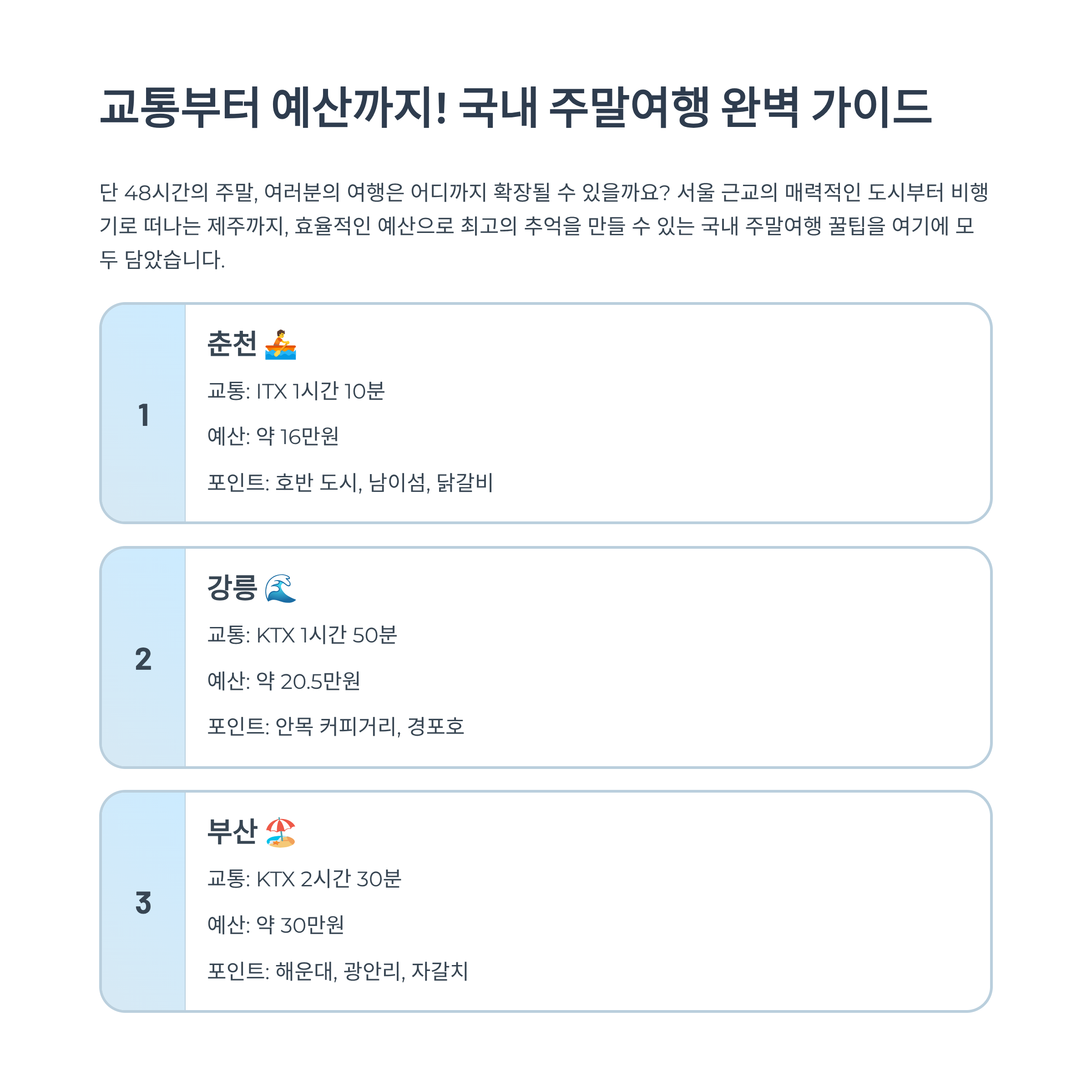 누구나 떠날 수 있는 춘천, 강릉, 부산, 전주, 제주를 중심으로 교통·예산·코스까지 정리했습니다.