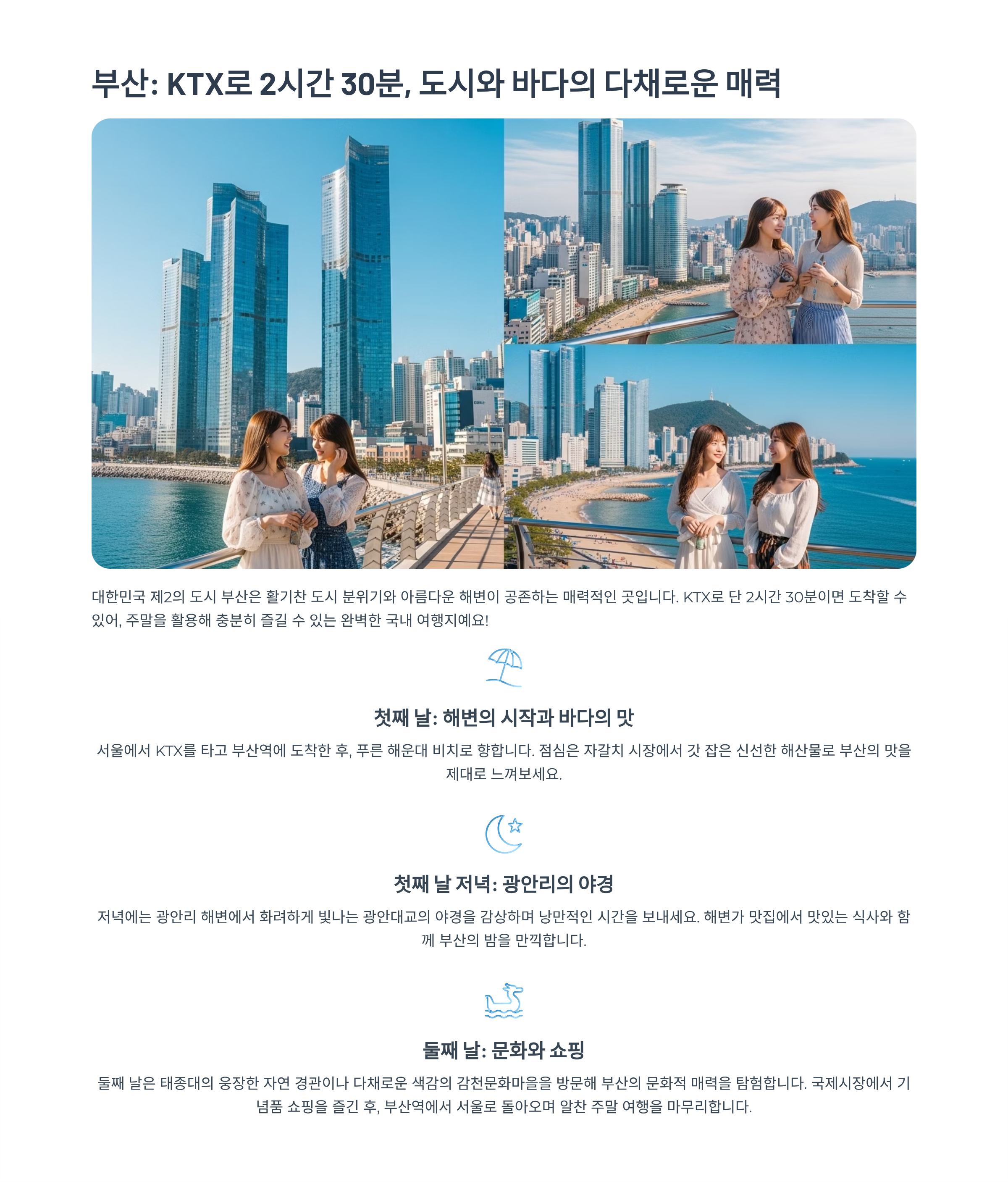 | 토요일 오전 | 서울 → 부산역 → 해운대 | 바다로 시작 |