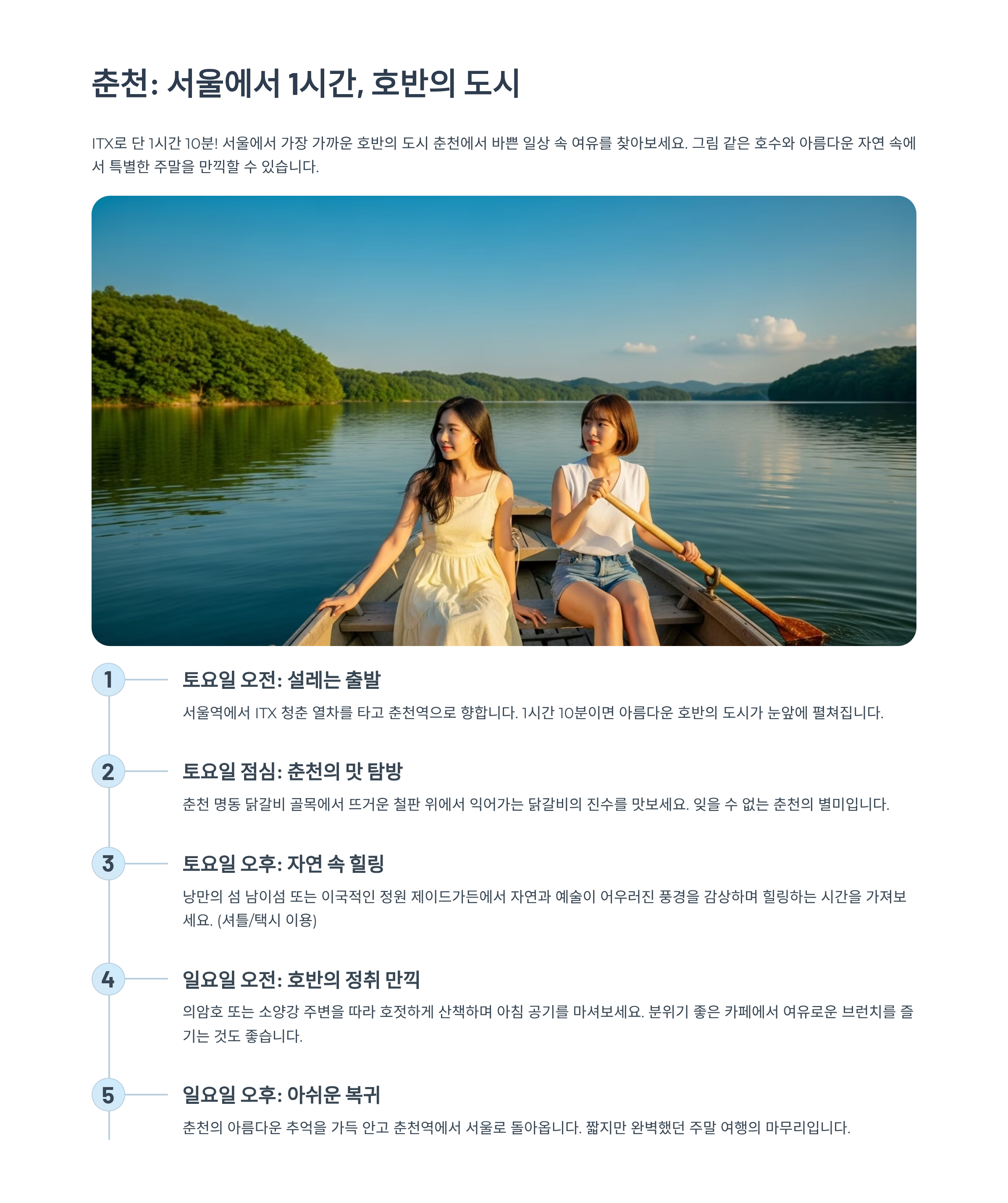 춘천은 교통 접근성이 좋아 주말 원데이에 최적화되어 있습니다.