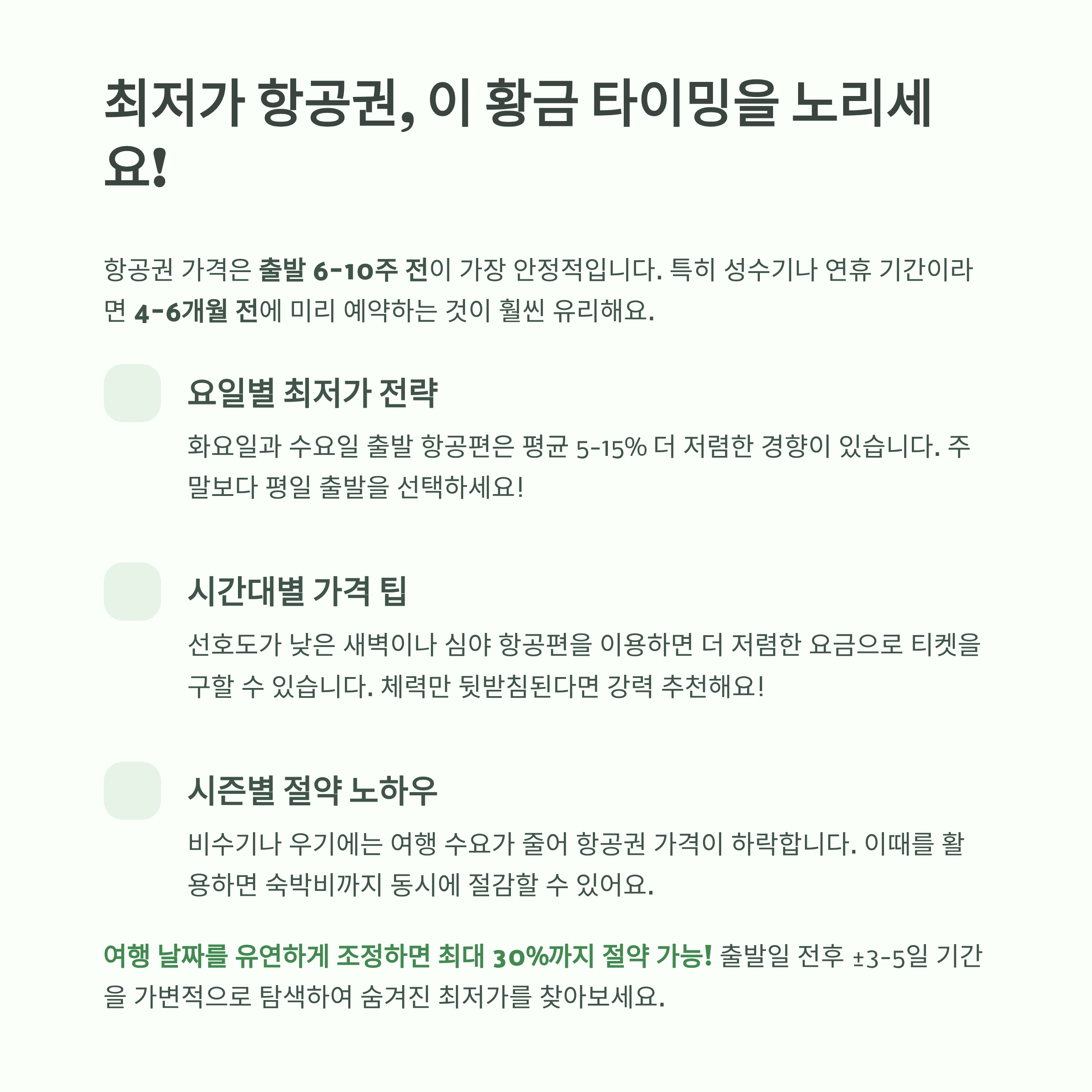 | 유연한 날짜 | ±3~5일 가변 탐색 | 달력 최저가 발견↑ |