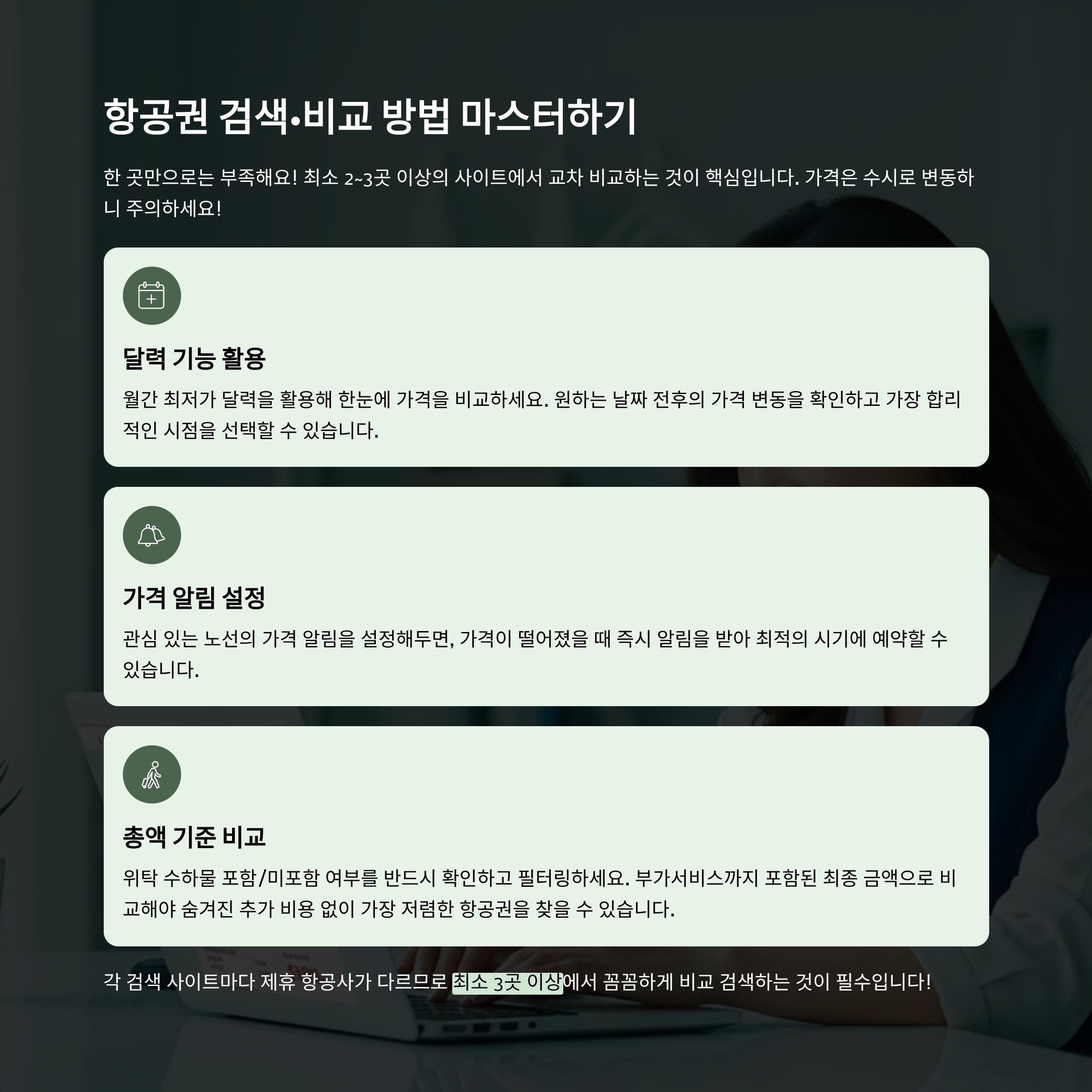 한 곳만 보지 말고 최소 2~3곳 교차 비교가 기본입니다. 가격 알림과 달력·그래프 보기를 적극 활용하세요.