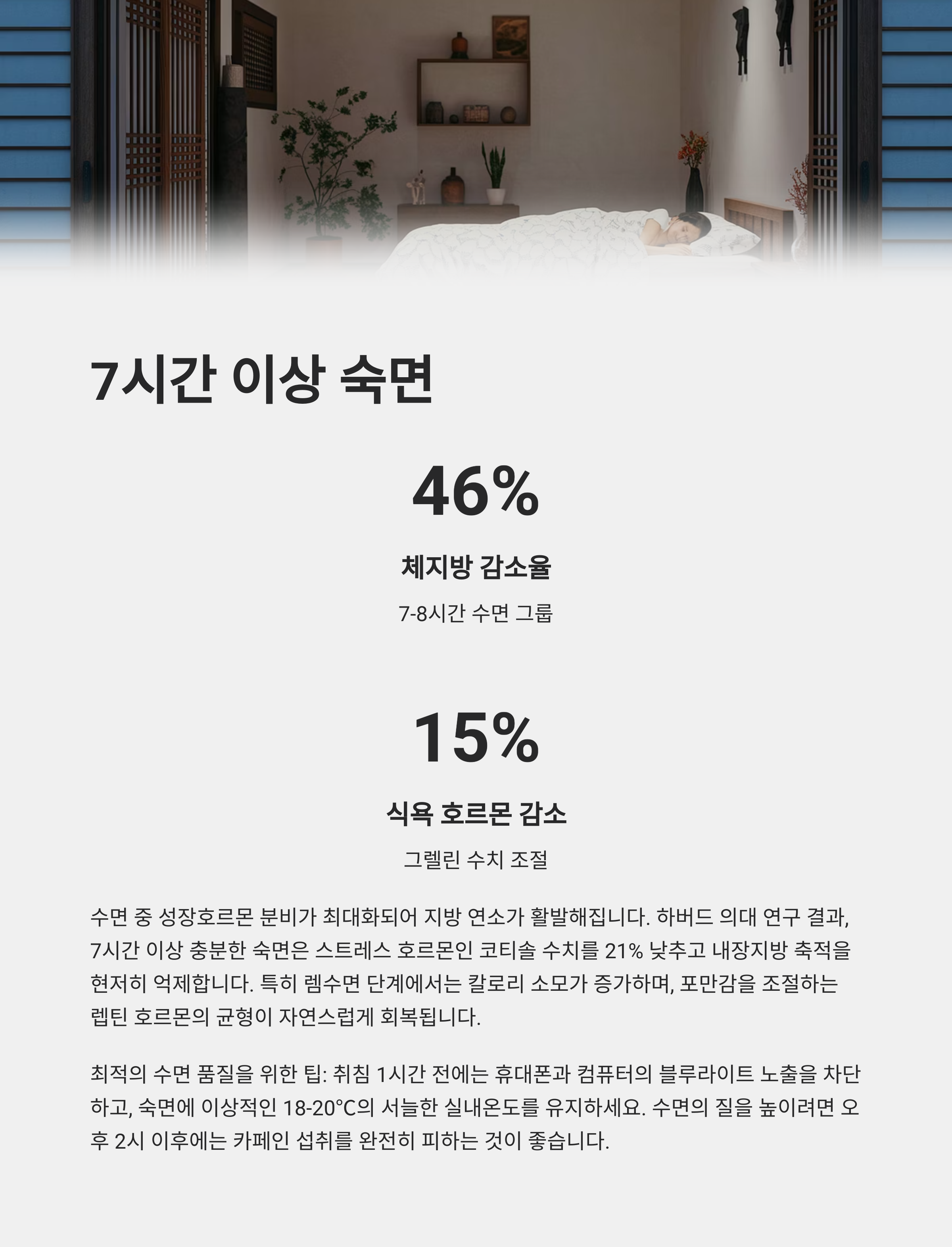 수면 부족은 렙틴 감소 + 식욕 증가로 지방 축적과 폭식 유발. 체중 조절엔 잠이 먼저입니다. - 스트레스 해소 루틴 1개 만들기