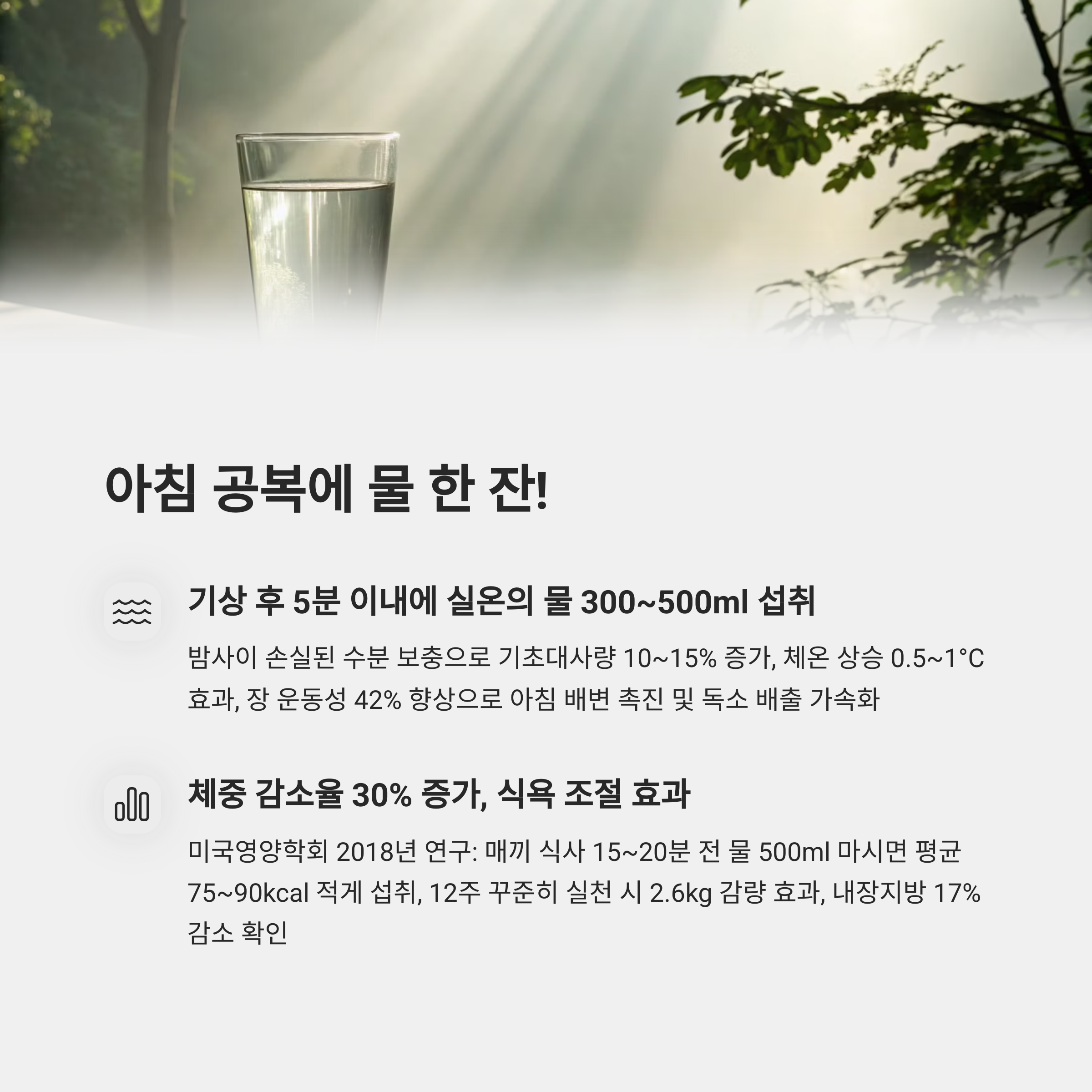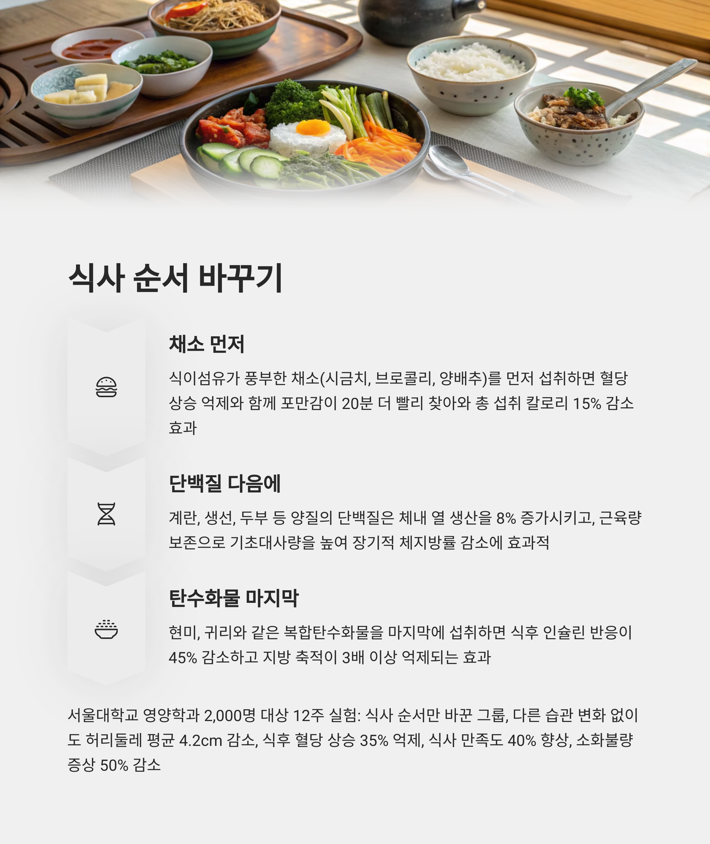 하루 수분 섭취량의 30%를 아침 공복에 채우면 신진대사 활성화 + 식욕 억제 효과가 함께 나타납니다. - 식사 순서 바꾸기: 채소 → 단백질 → 탄수