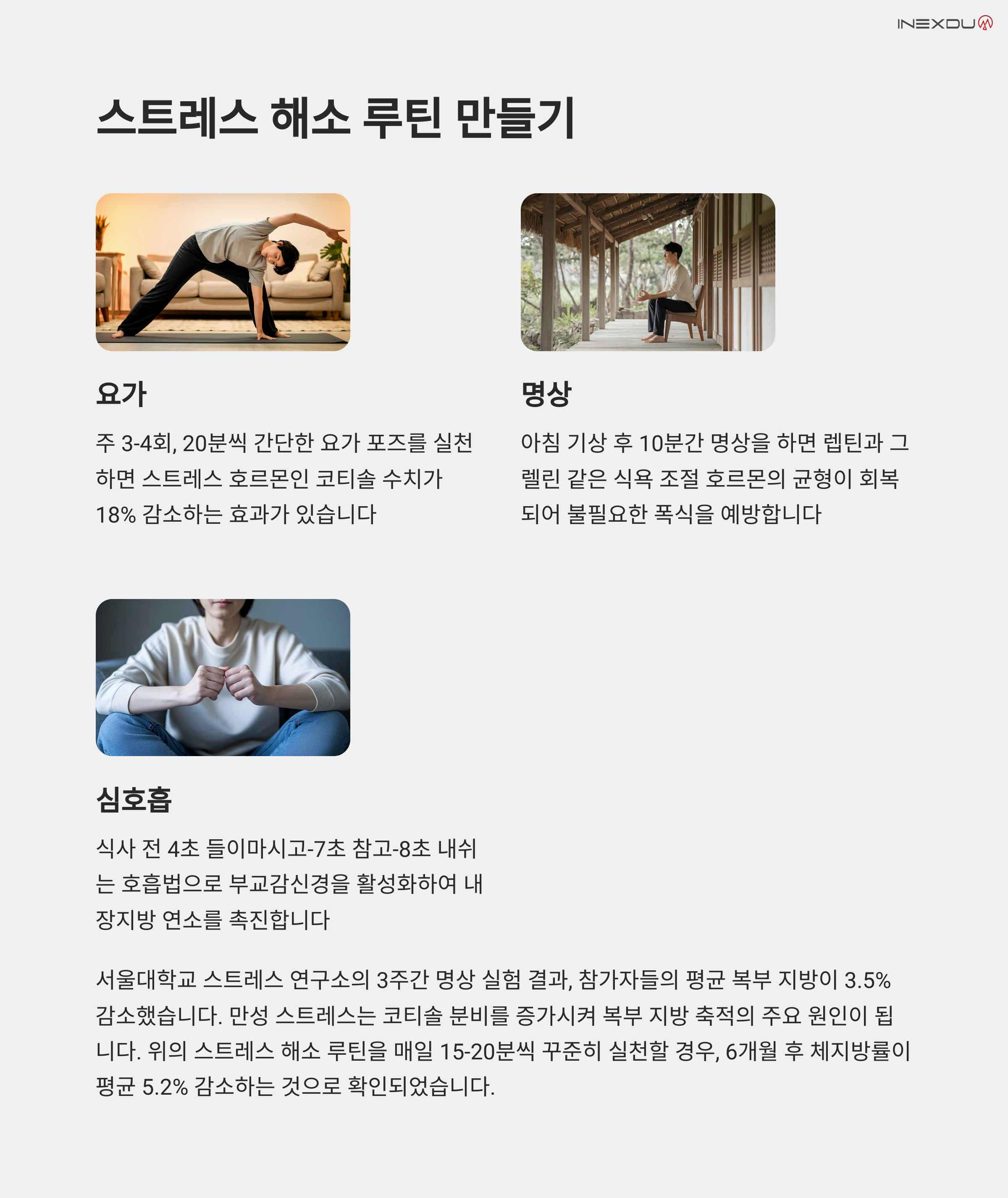 만성 스트레스는 코르티솔 증가 → 복부지방 증가로 이어집니다. 산책, 일기쓰기, 음악 등 나만의 해소법을 정해보세요.