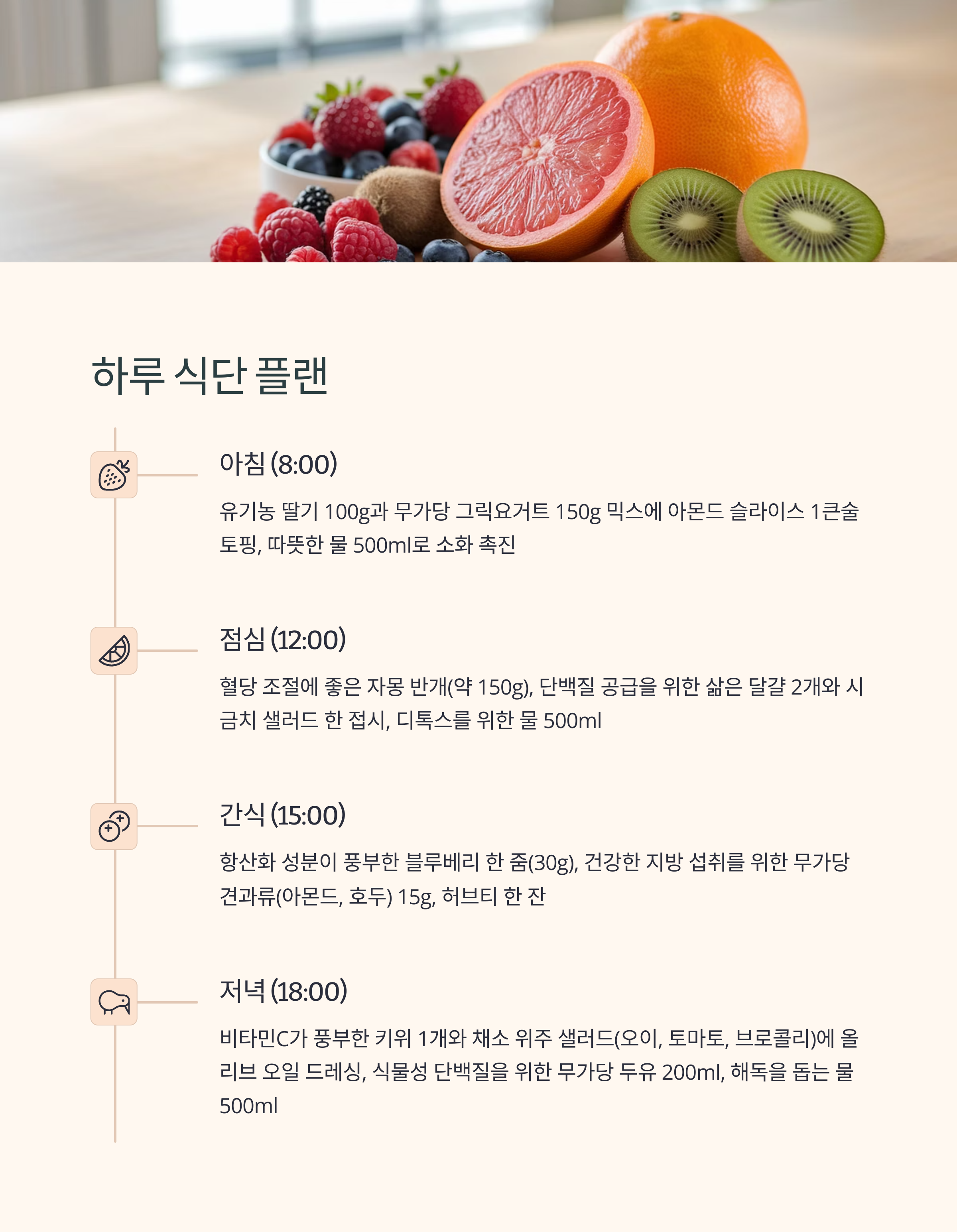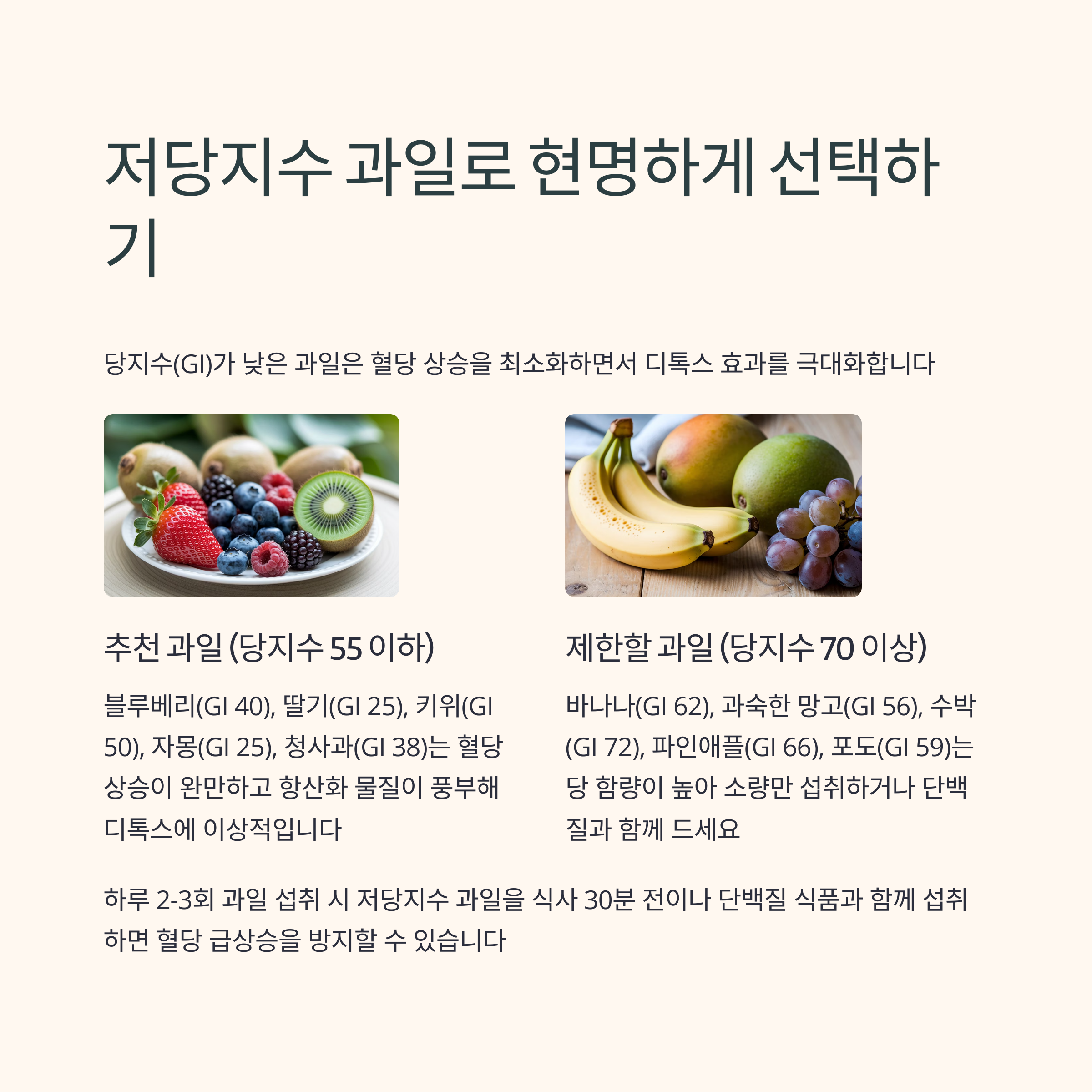 추천 과일은 블루베리, 사과, 자몽, 파인애플 등 당지수가 낮고 수분·섬유질이 풍부한 과일이에요. 1~3일 동안 아침 공복이나 간식 대체로 섭취하고, 단백질 보충과 수분 섭취는 꼭 병행해 주세요. 해독이 목적이라면 가볍고 기분 좋은 루틴으로 유지하는 것이 가장 중요합니다.