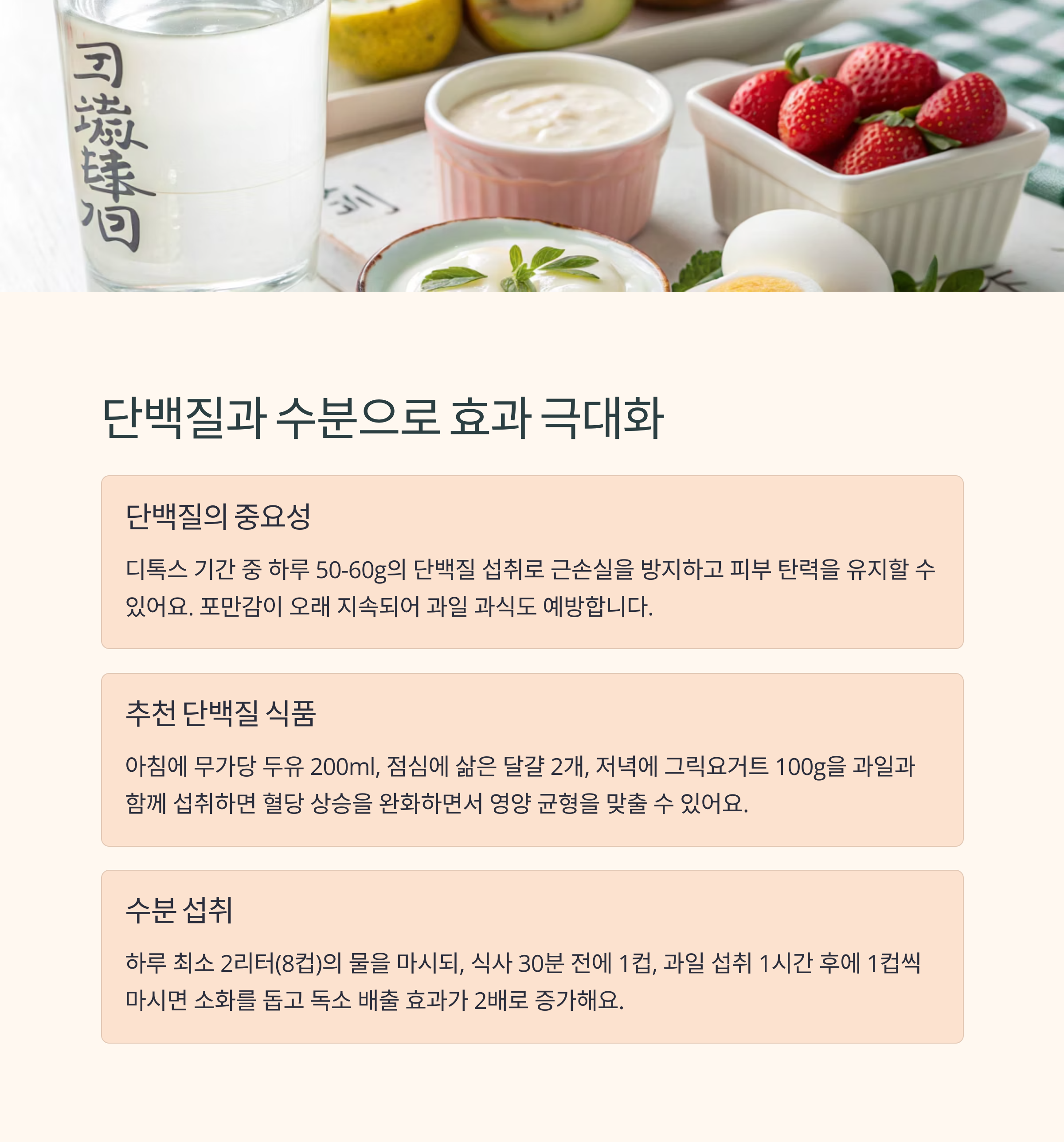 | 노폐물 배출, 부종 완화, 피부 투명도 개선 | 혈당 민감자, 저혈압, 활동량 많은 직군 | 1~3일 한정, 아침 또는 간식 대체, 물과 단백질 병행 |