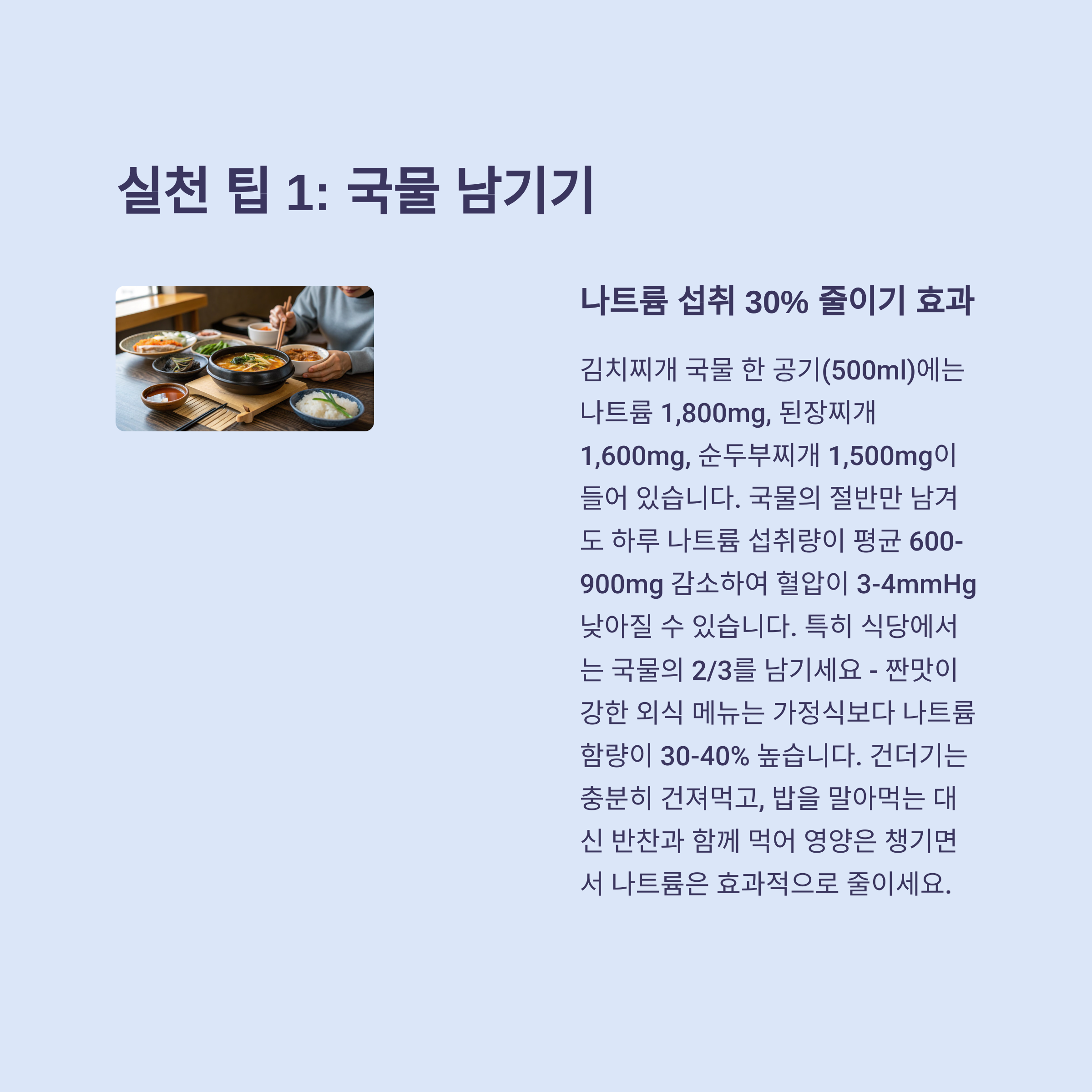 - 3. 국물 위주의 음식 (국밥, 찌개류): 국물은 염분 과잉의 주요 원인