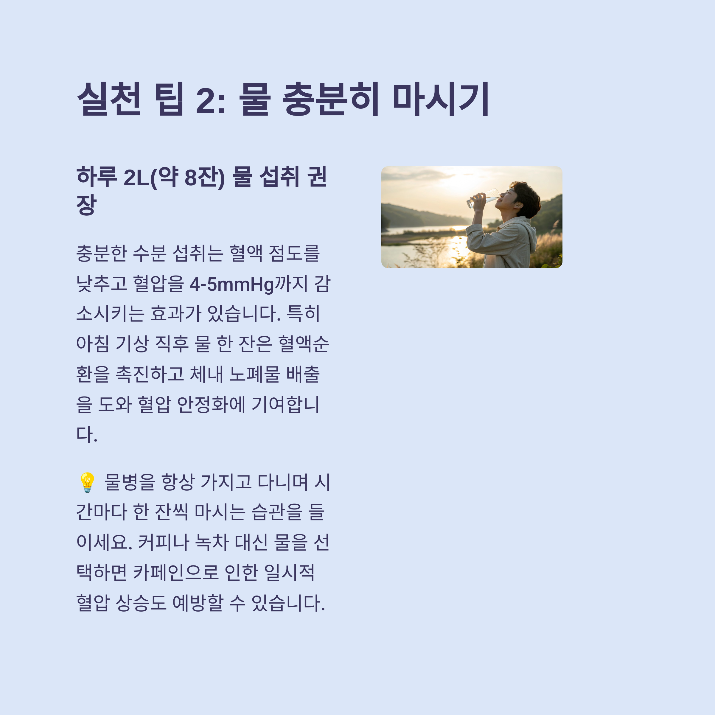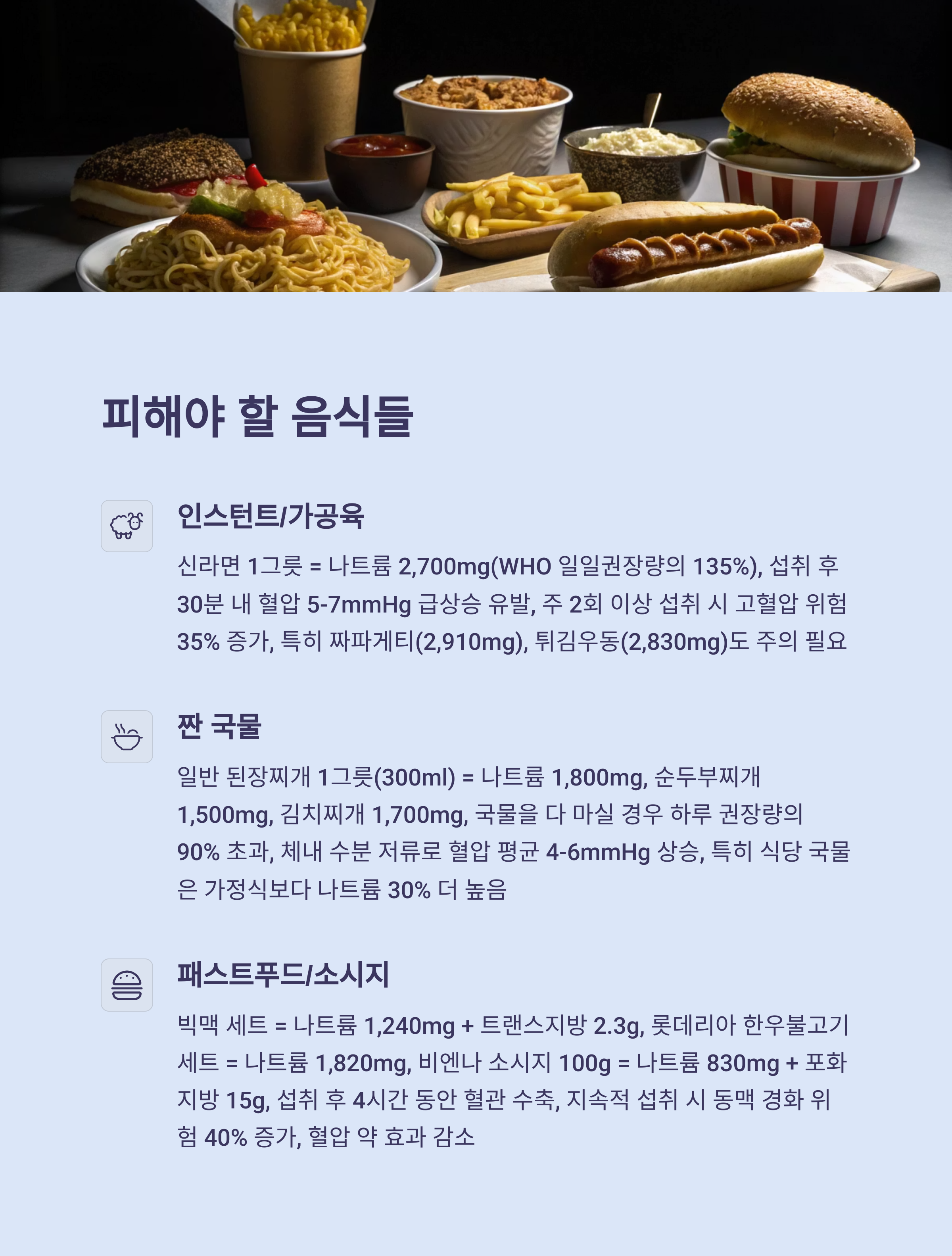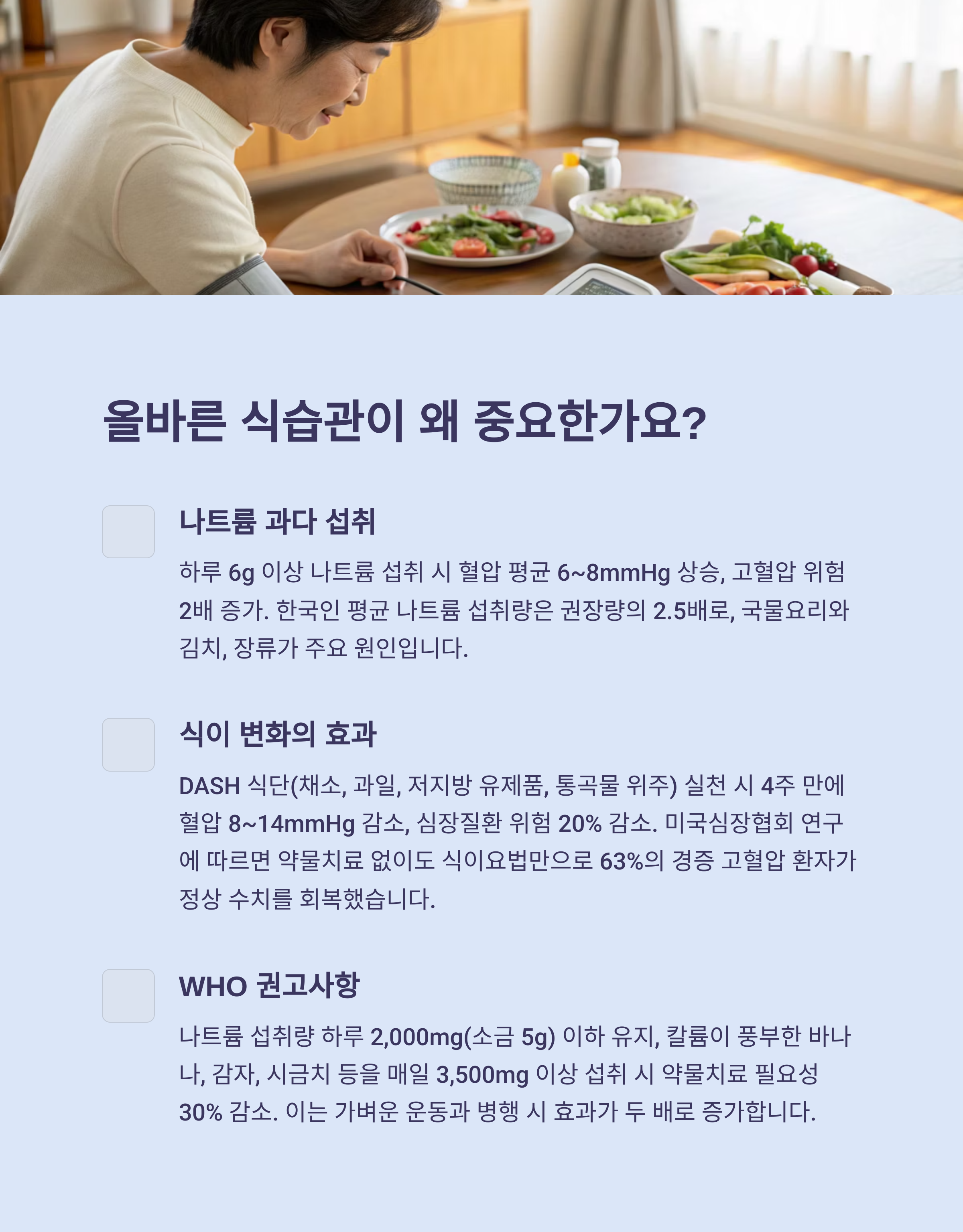 | 주요 키워드 | 고혈압 식단, 나트륨 제한, 칼륨 섭취, 혈압 낮추는 음식, 짠 음식 피하기 |