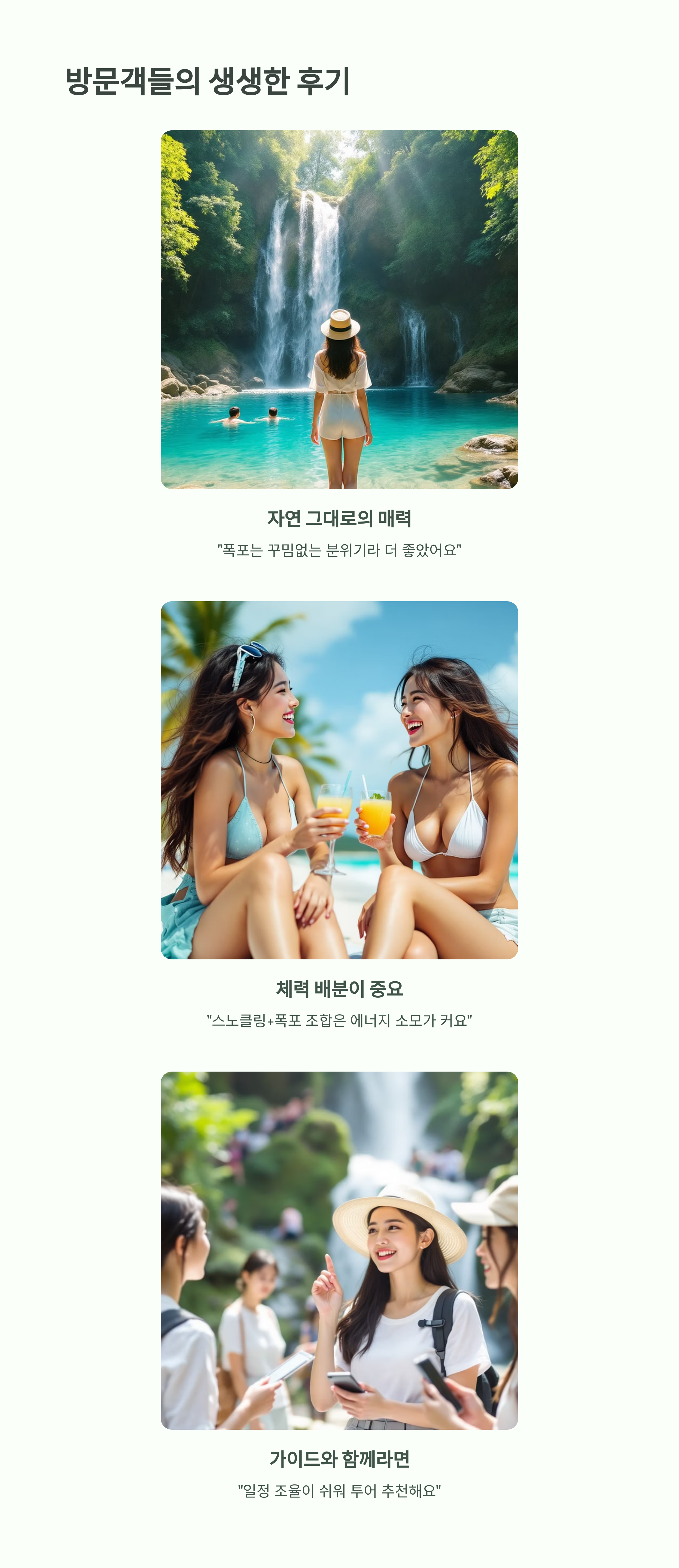 | 체력 배분 중요 | 스노클링 + 폭포 조합은 꽤 에너지 소모돼요 |