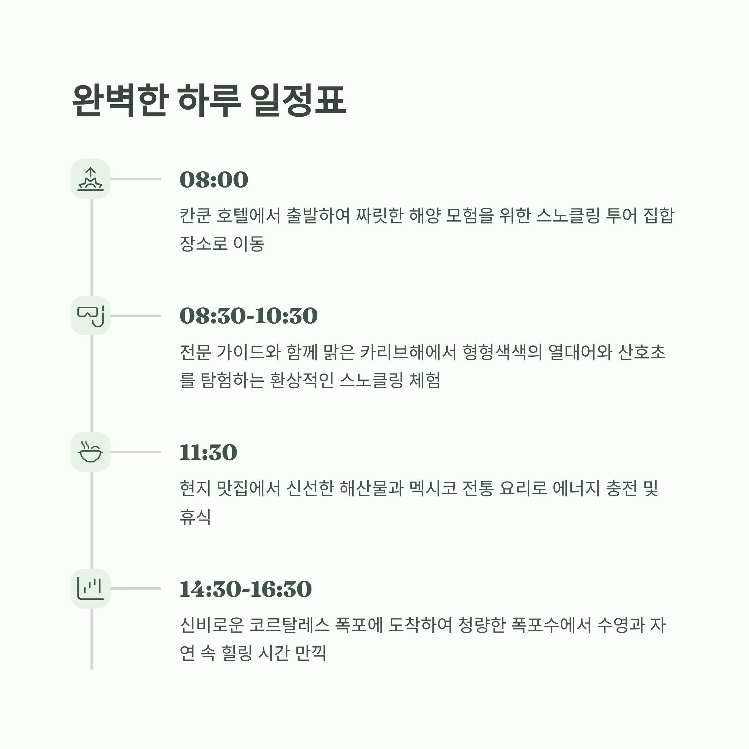 | 08:00 | 칸쿤 호텔 출발, 스노클링 투어 참여 |