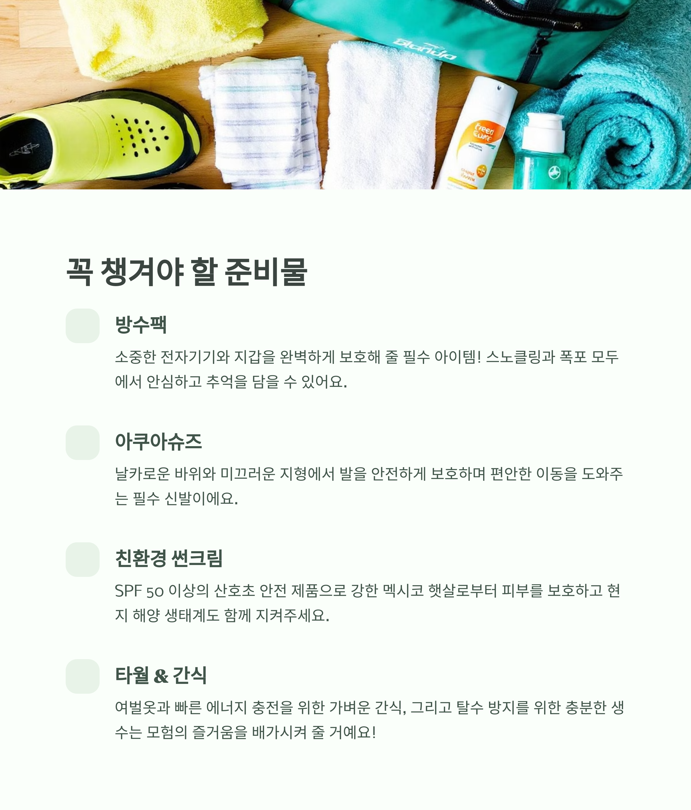 | 썬크림 | SPF 높은 제품 권장 (환경 친화 제품 사용 권장) |