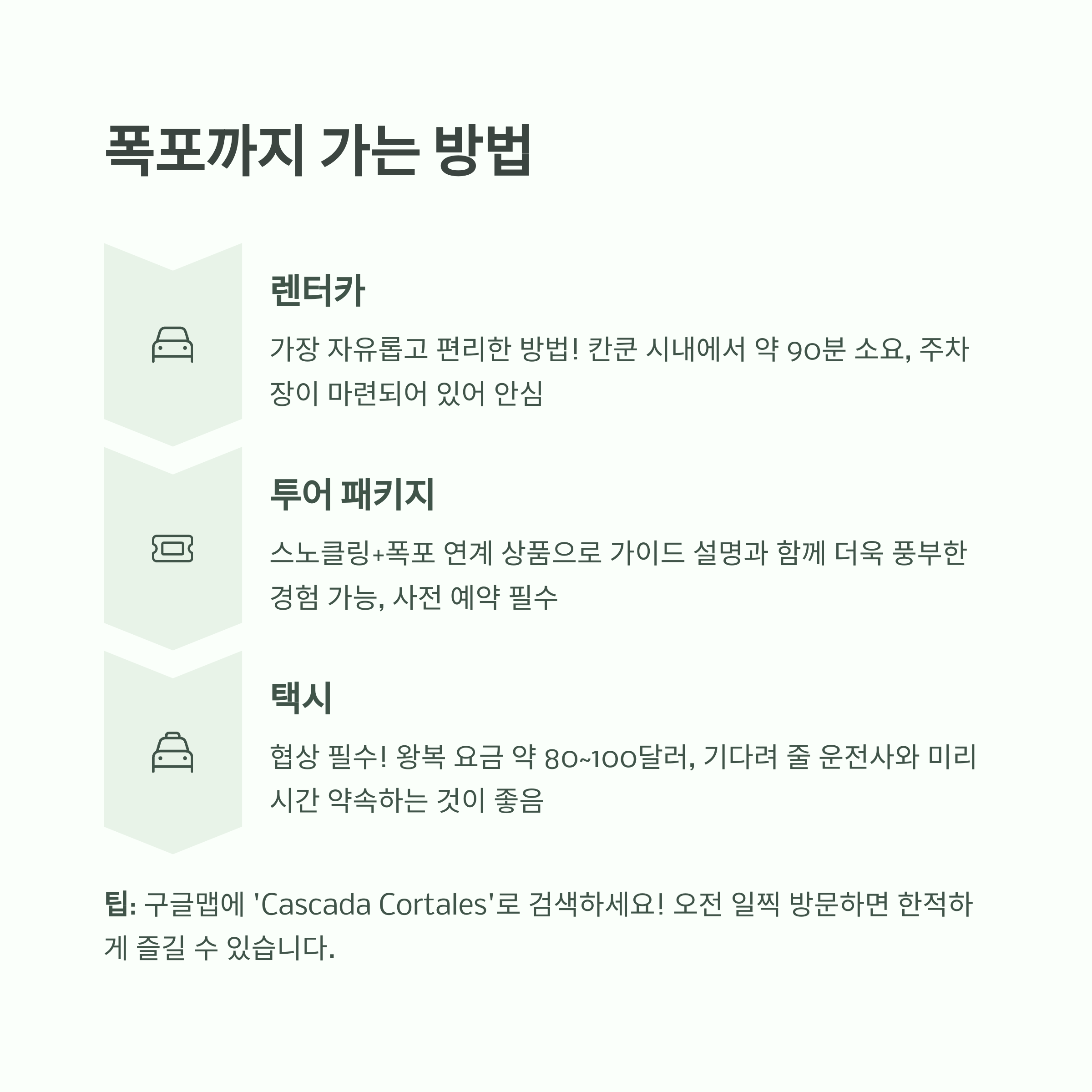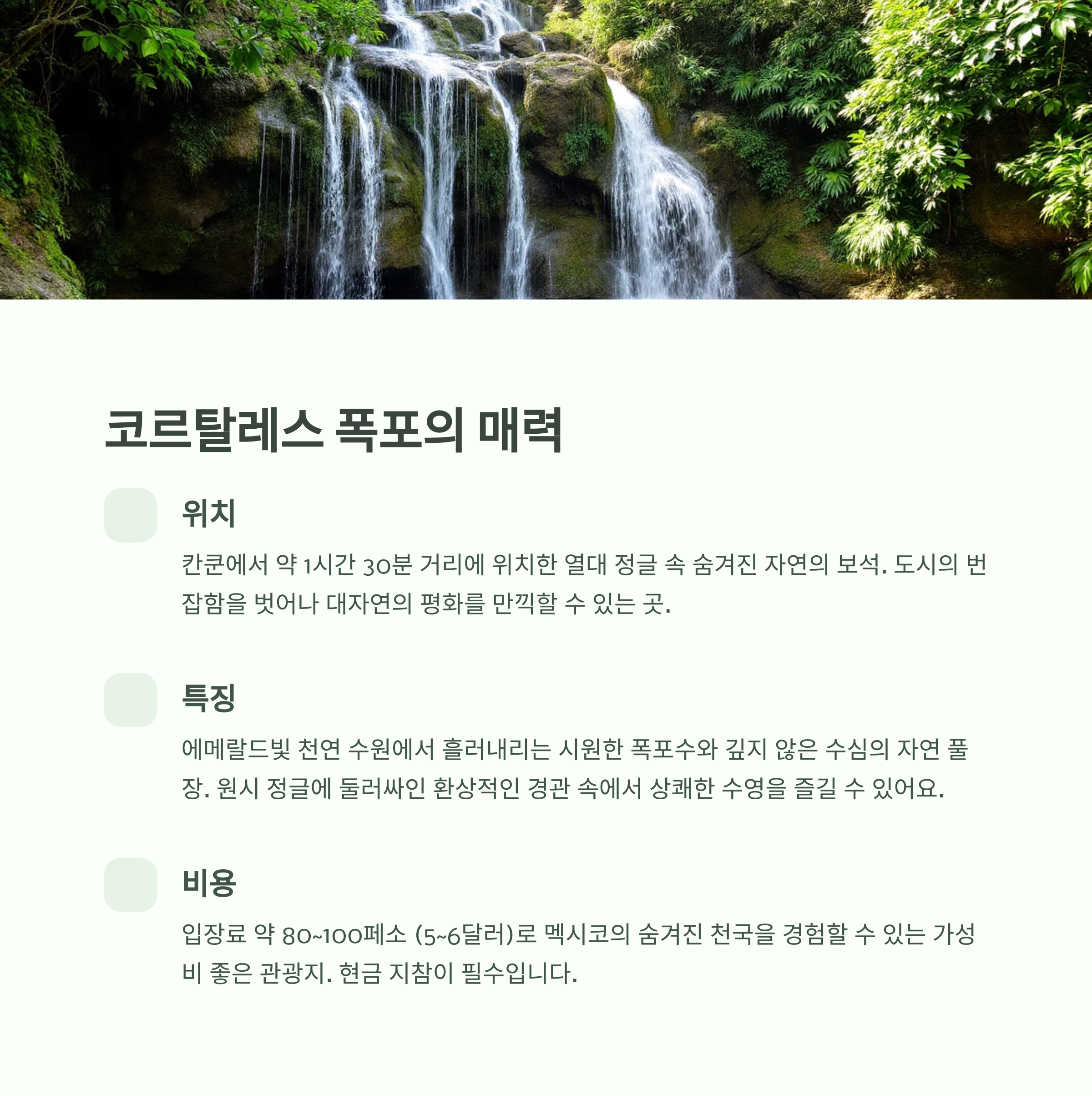 이번 글에서는 칸쿤 스노클링 포인트, 코르탈레스 폭포 이동법,