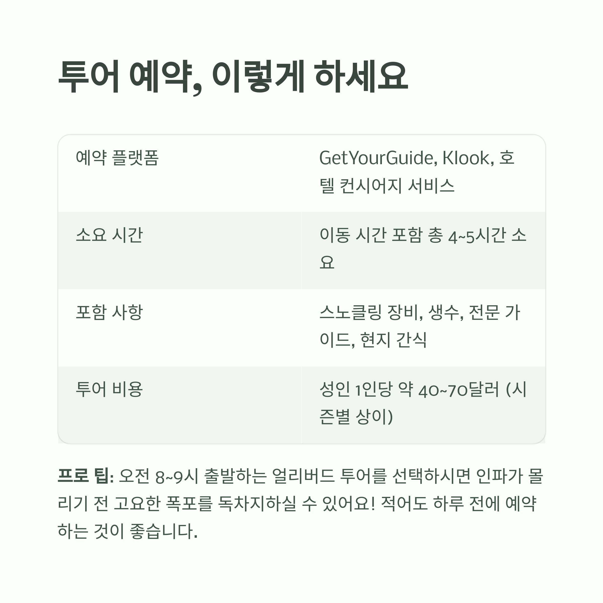 - 투어 포함 패키지: 스노클링+폭포 연계 상품 일부 존재