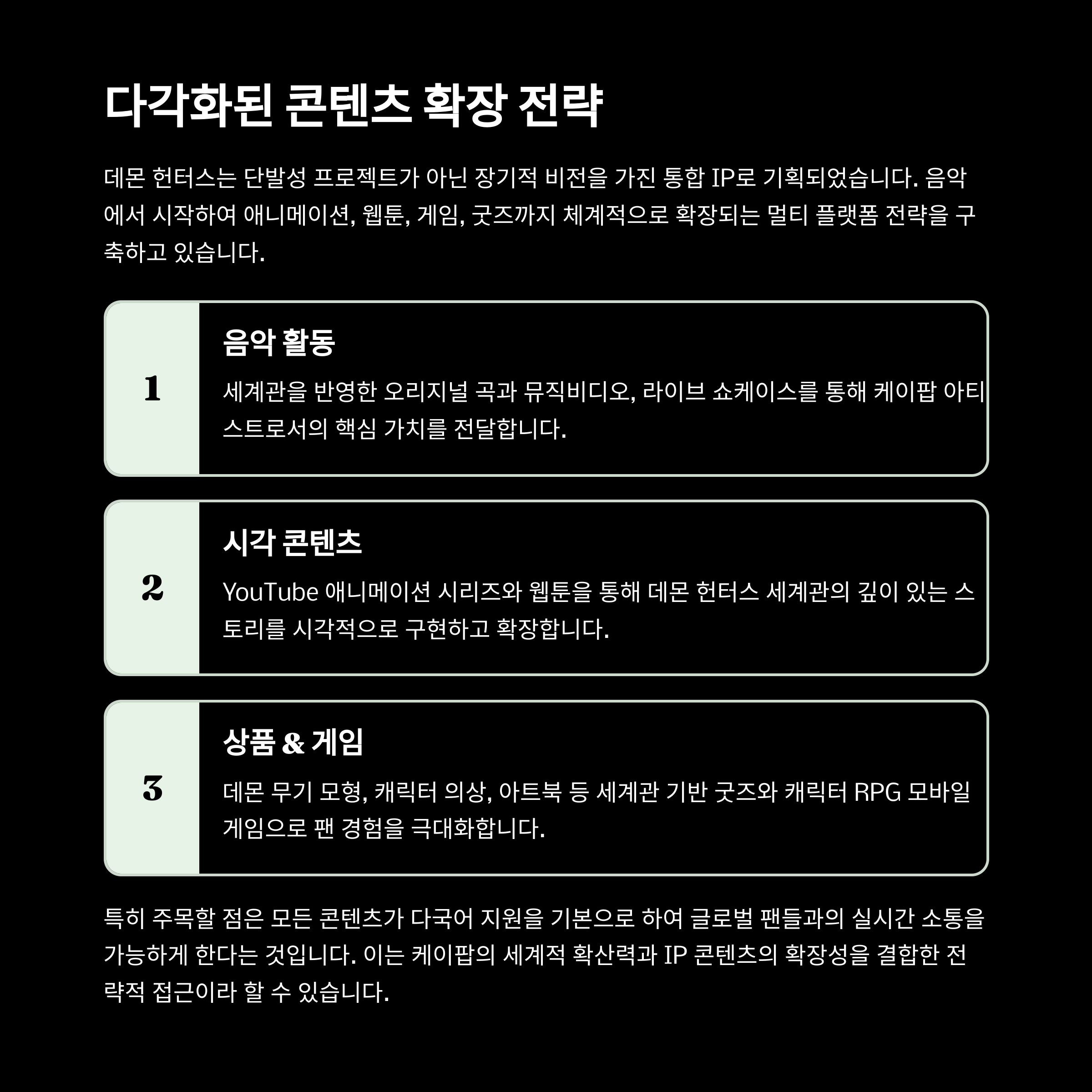 ‘팬덤의 소비 동선’ 자체가 다양화되고 확장됩니다. 이는 글로벌 시장에서 매우 유리한 구조예요.