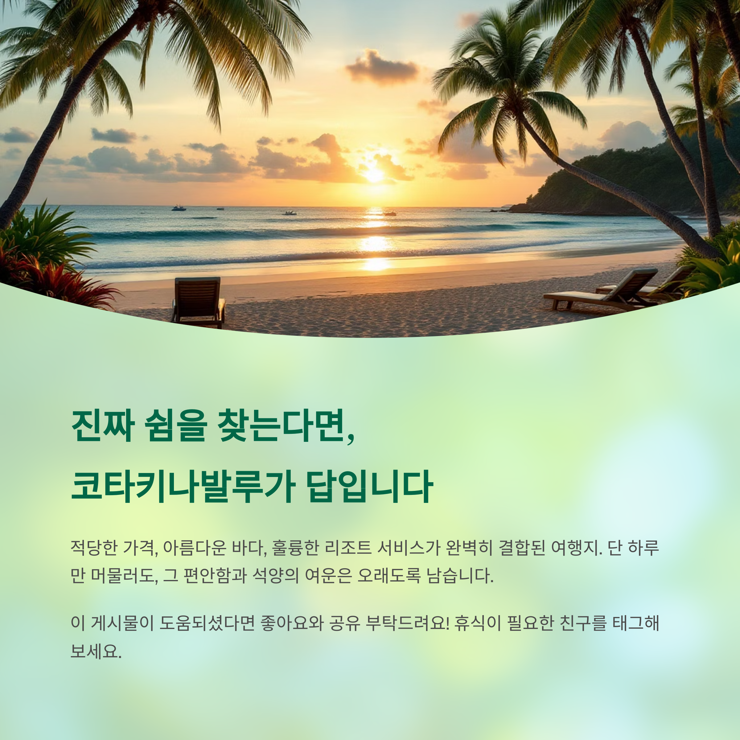 적당한 가격, 아름다운 바다, 훌륭한 리조트 서비스가 완벽히 결합된 여행지입니다.