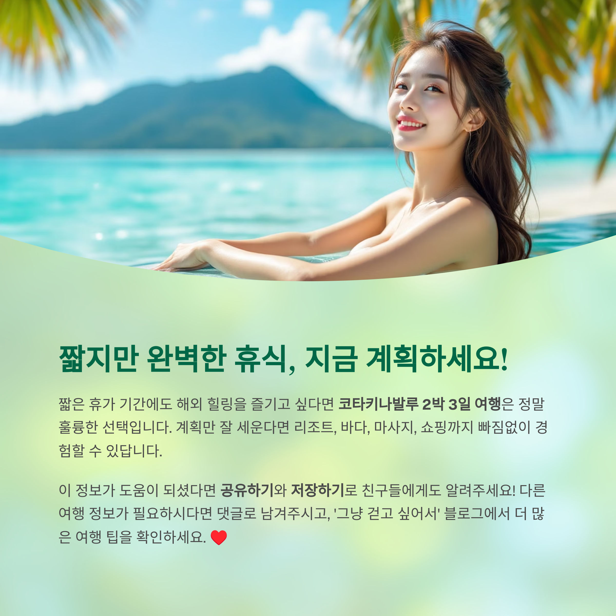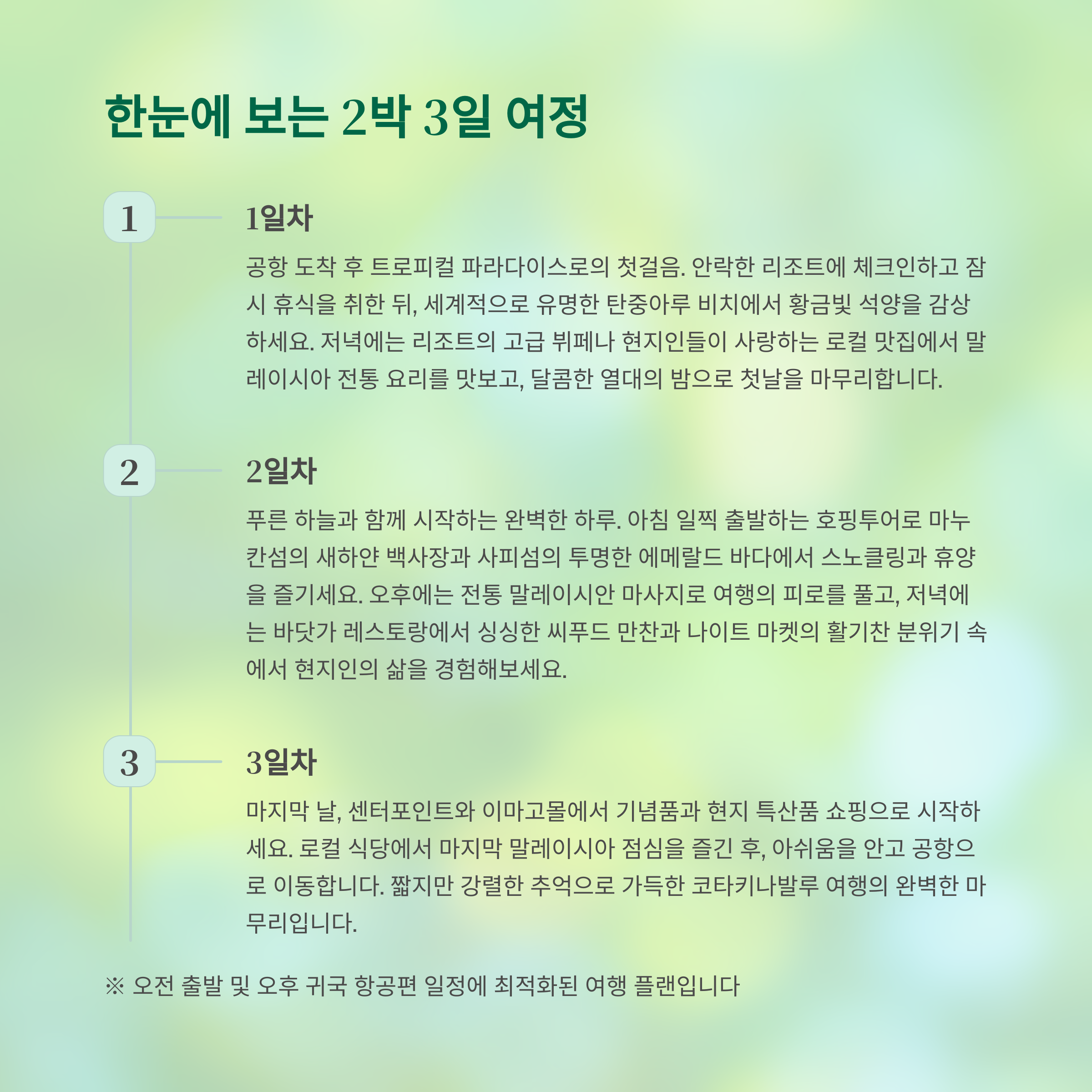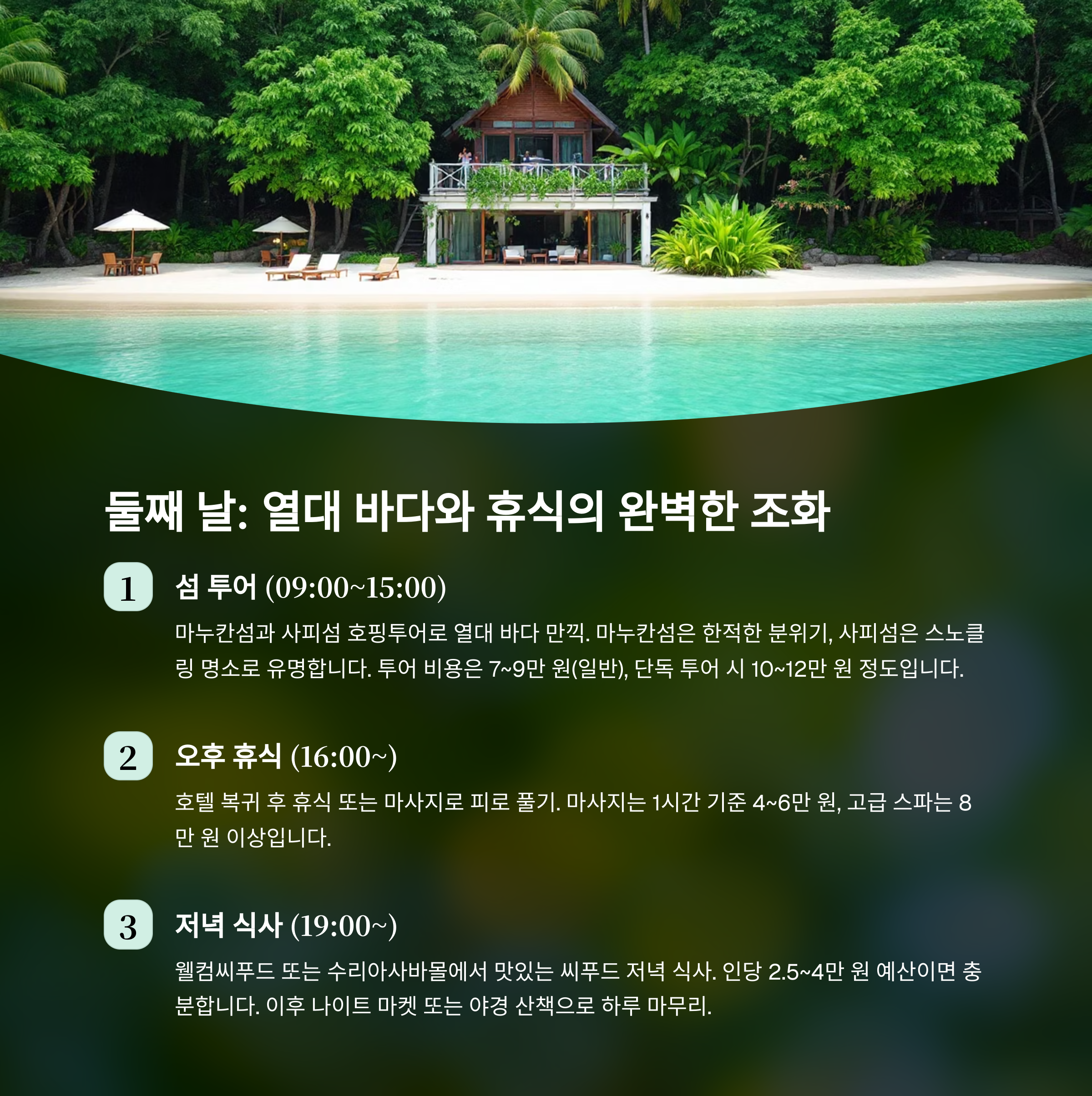 - 시간이 짧은 만큼 리조트+섬투어 중심 루트가 핵심이에요