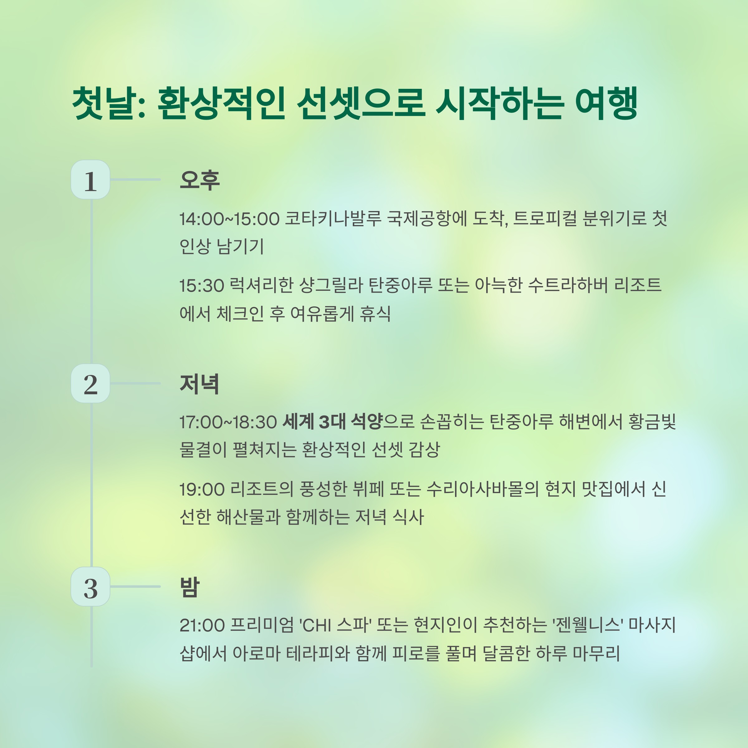 | 1일차 | 공항 도착, 리조트 체크인, 선셋 감상 | 탄중아루 |