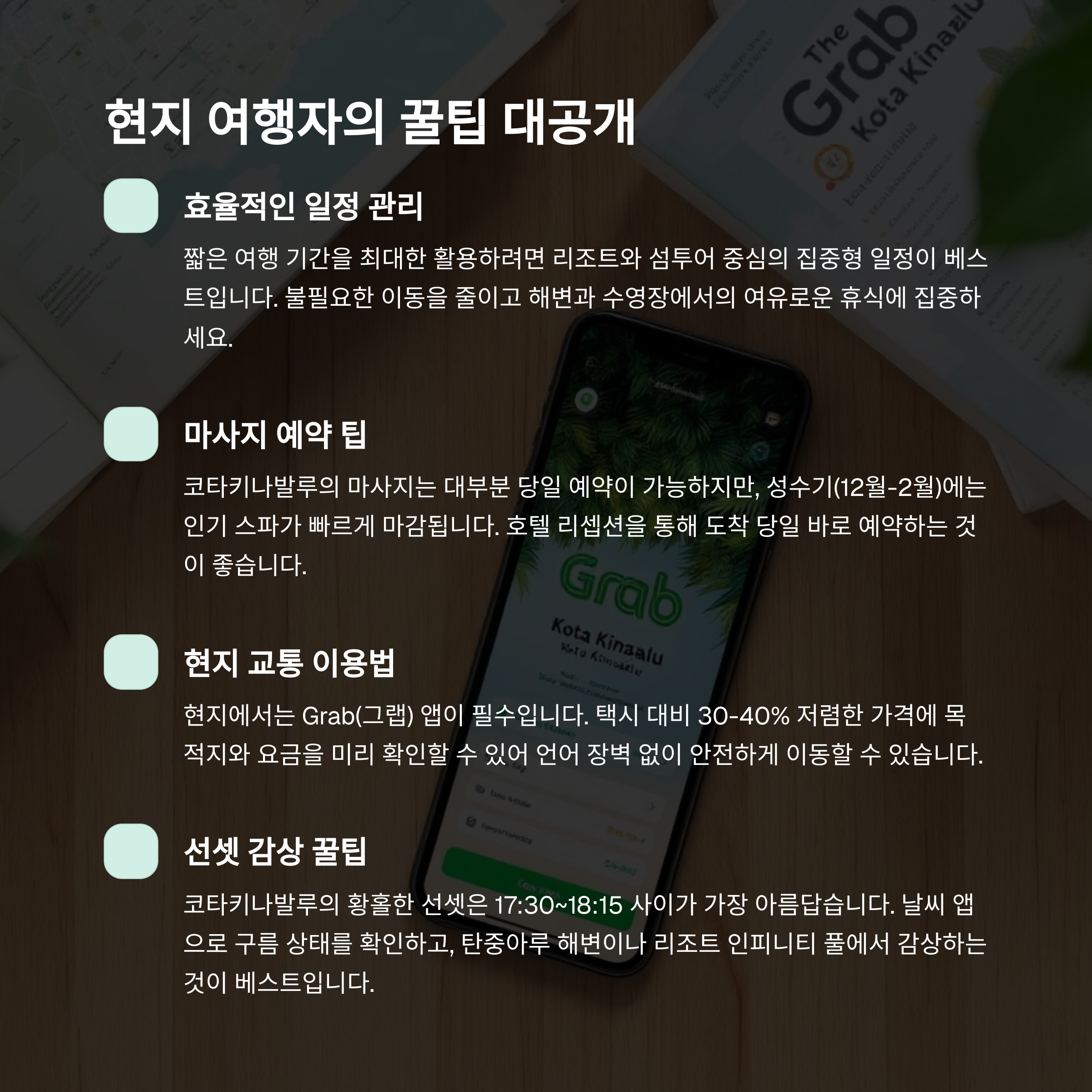 - 현지 교통은 Grab(그랩) 앱 필수 – 저렴하고 정확해요