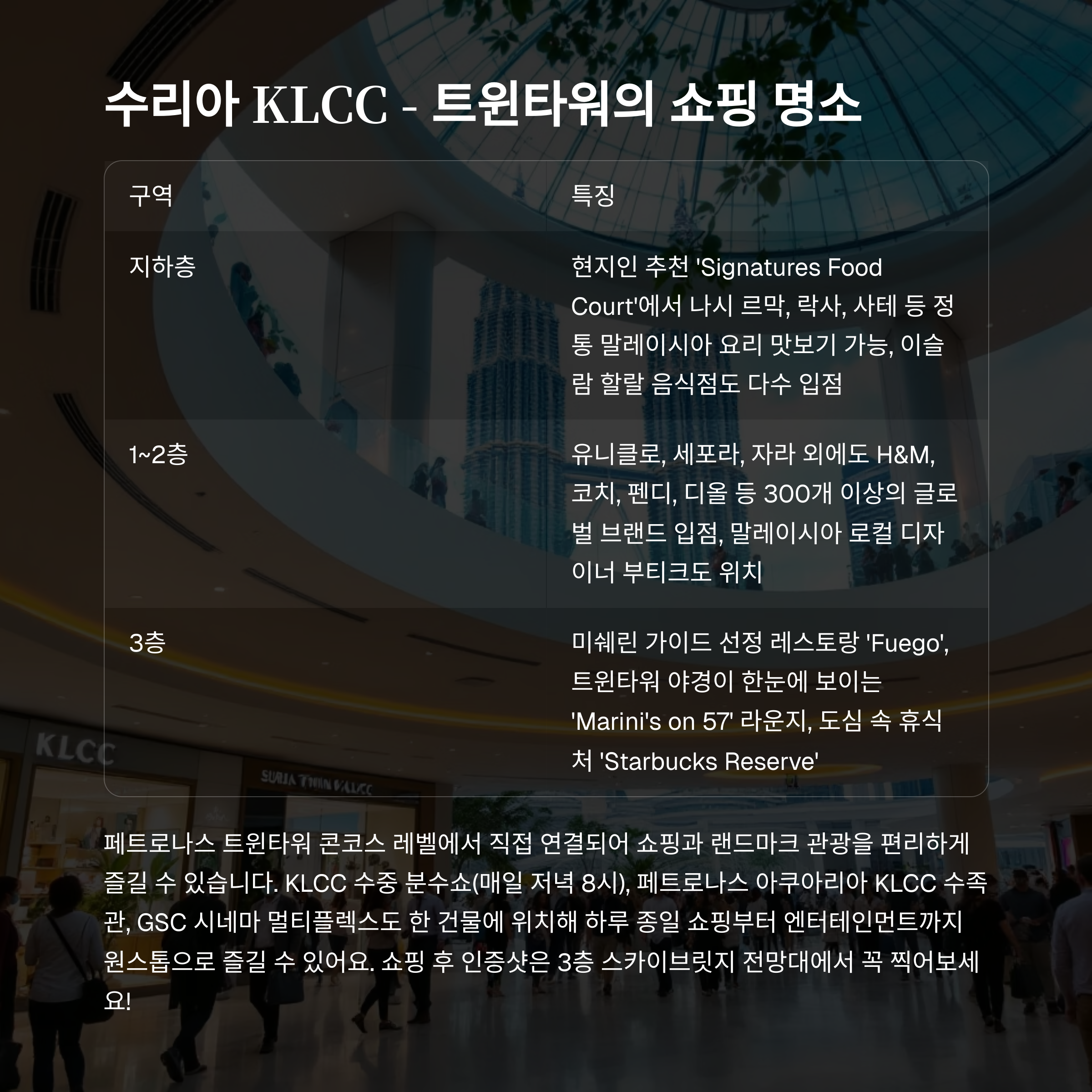 페트로나스 트윈타워 바로 아래 위치한 대형 쇼핑몰이에요.
