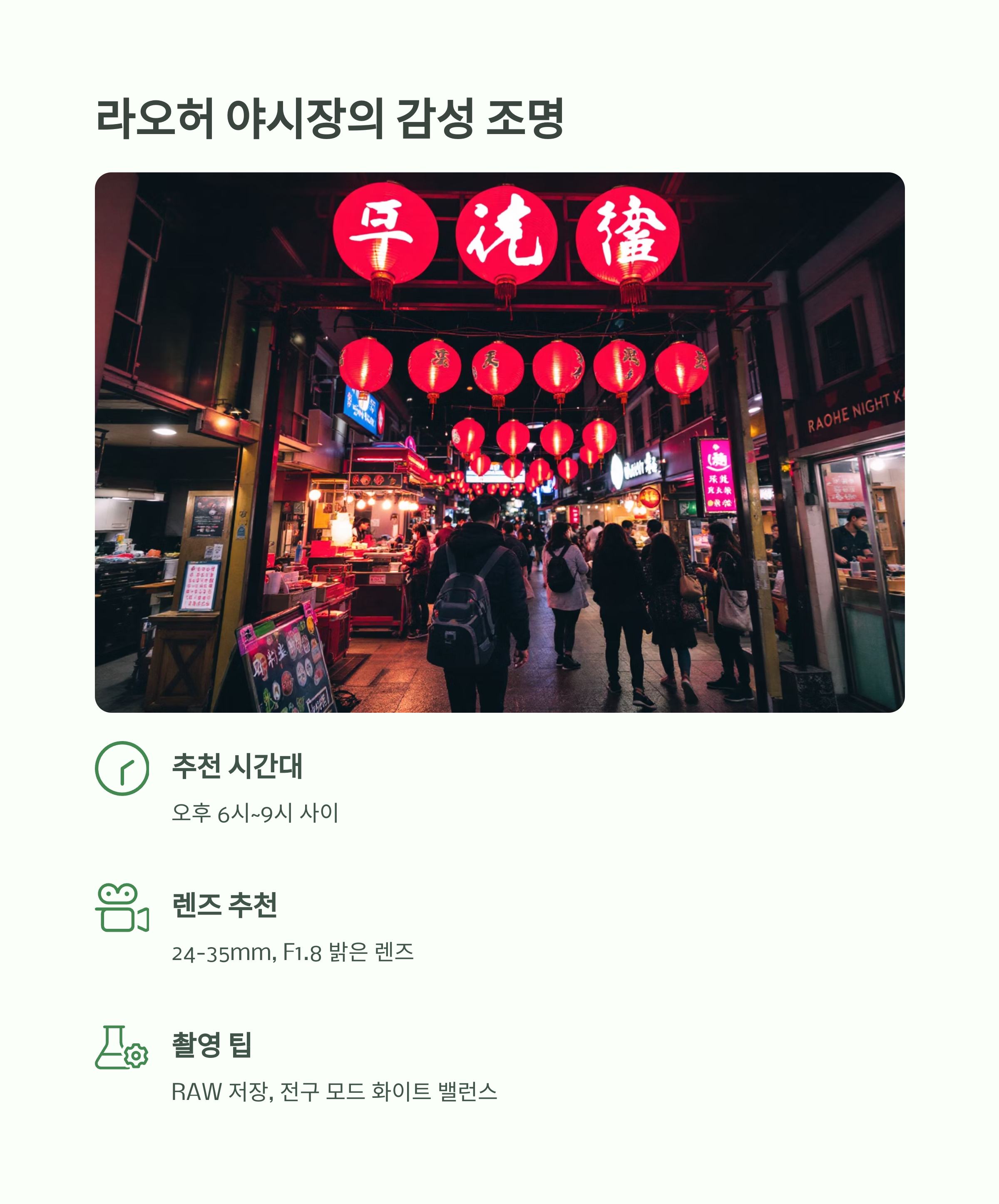 전통적인 대만 야시장 감성을 담은 조명 풍경을 찍기 좋은 곳입니다.