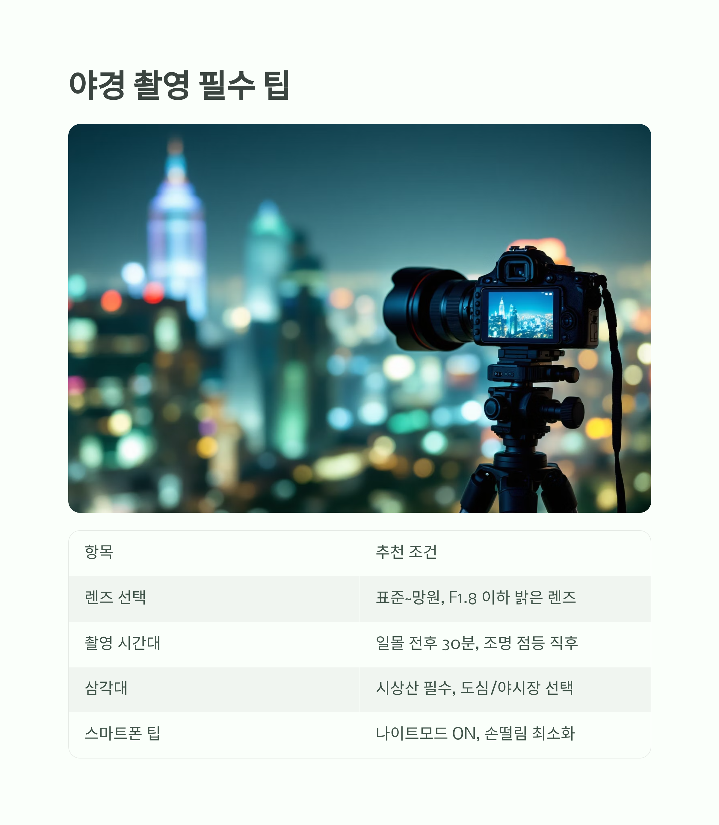 | 촬영 시간대 | 일몰 전후 30분 or 조명 점등 직후 |