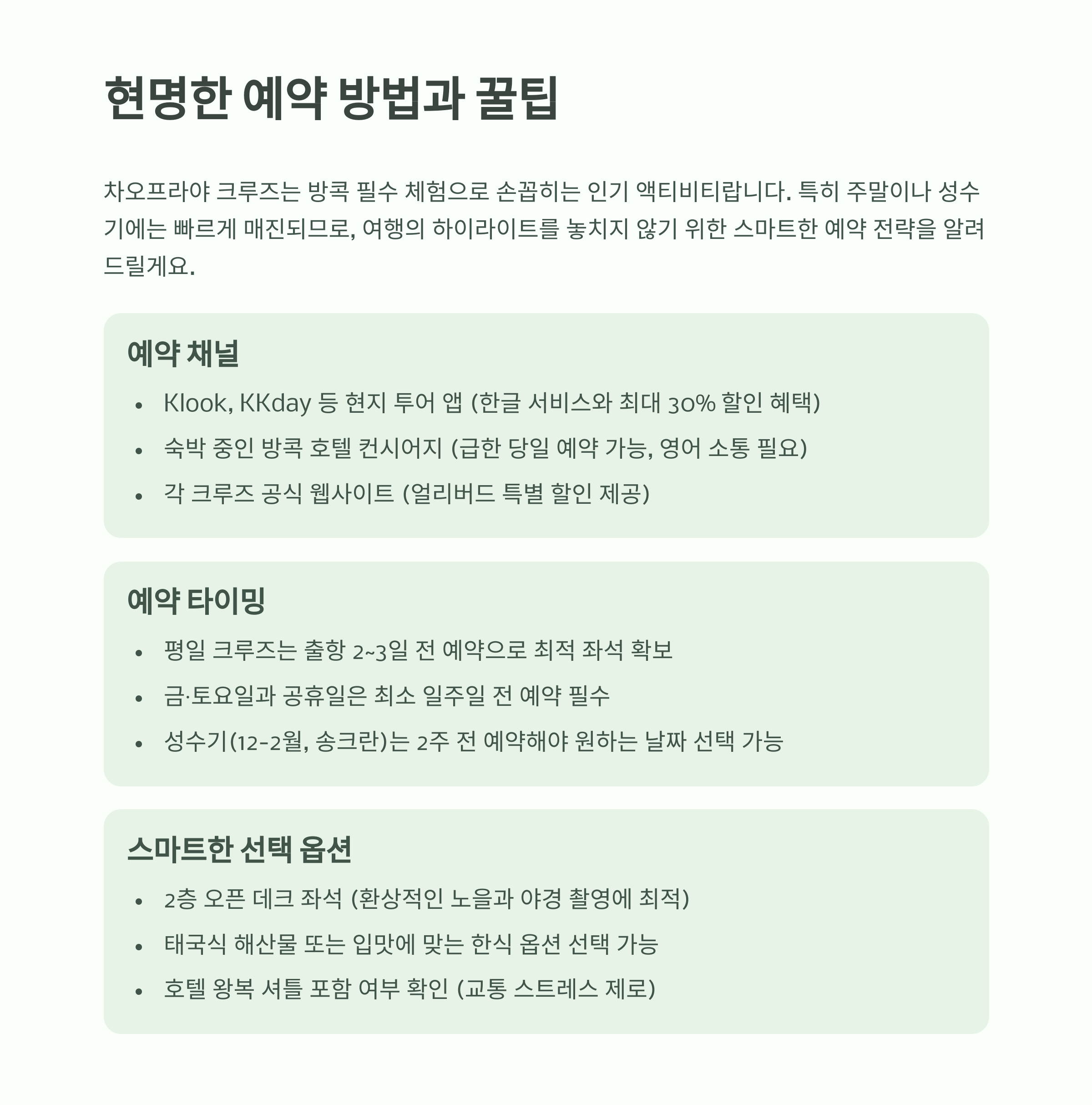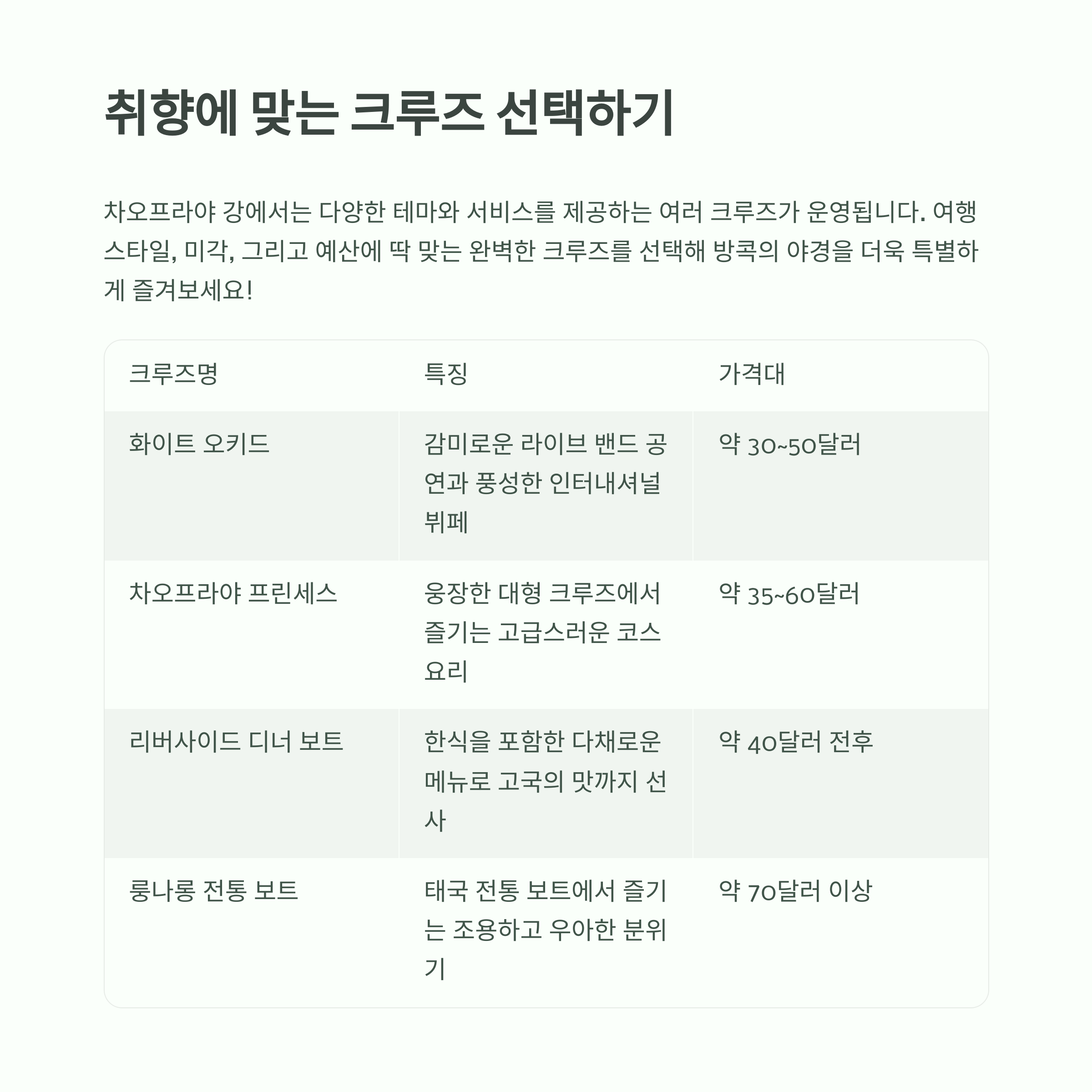 | 차오프라야 프린세스 | 대형 크루즈, 다양한 코스식 | 약 35~60달러 |