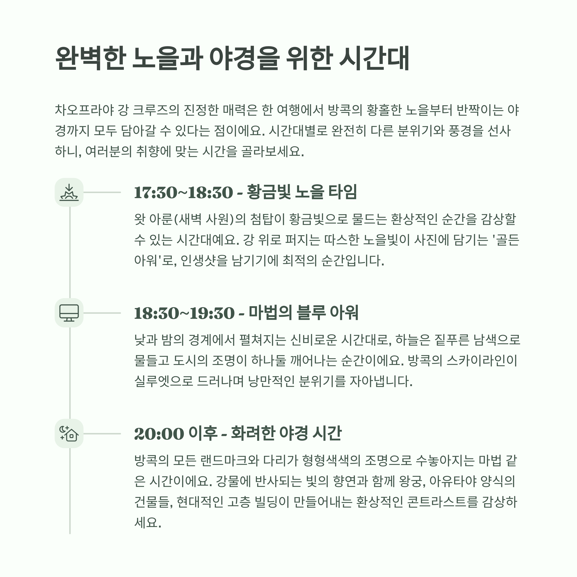 | 아시아티크 | 밤시장과 연계 일정에 적합 |