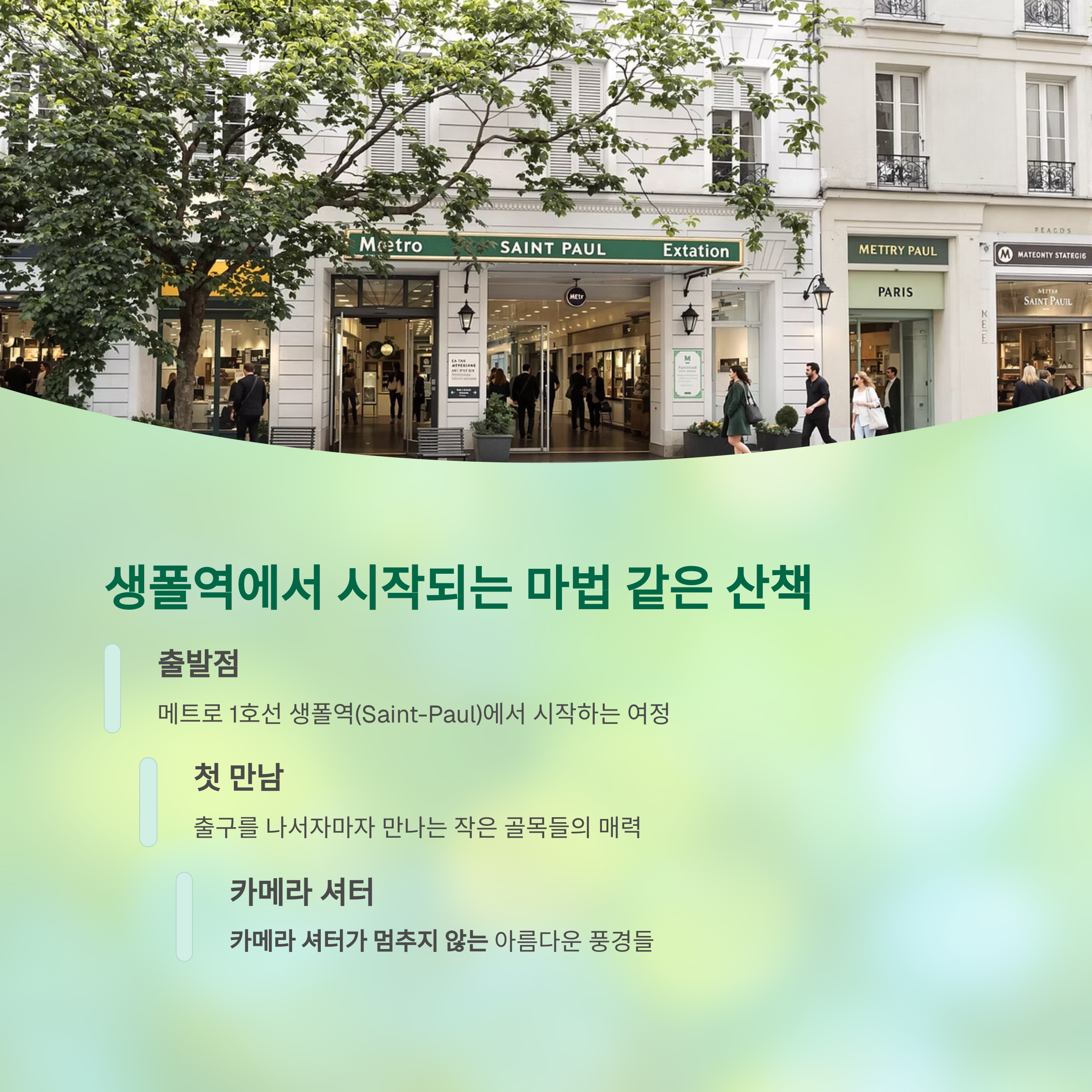 산책은 보통 메트로 1호선 생폴역(Saint-Paul)에서 시작해요.