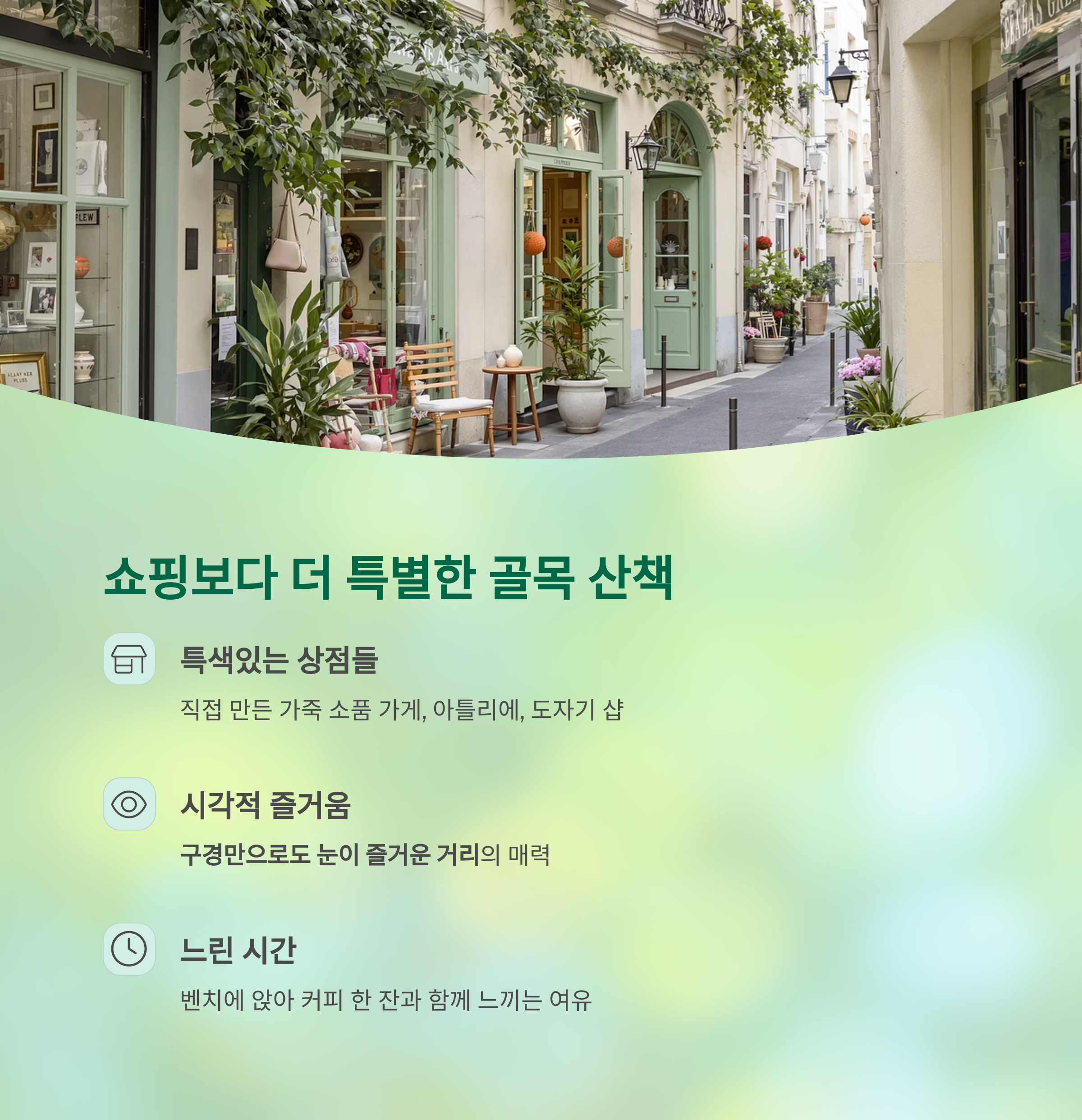 | 오후 | 쇼핑 골목 | 감성 부티크와 갤러리 |