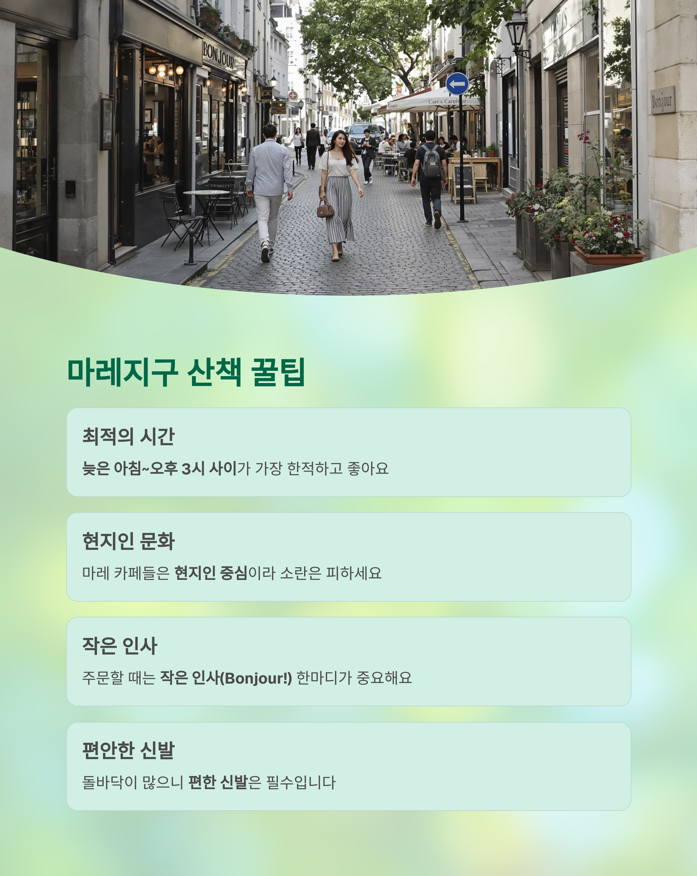 - 마레 카페들은 대부분 현지인 중심이라 큰 소란은 피하지 않아요