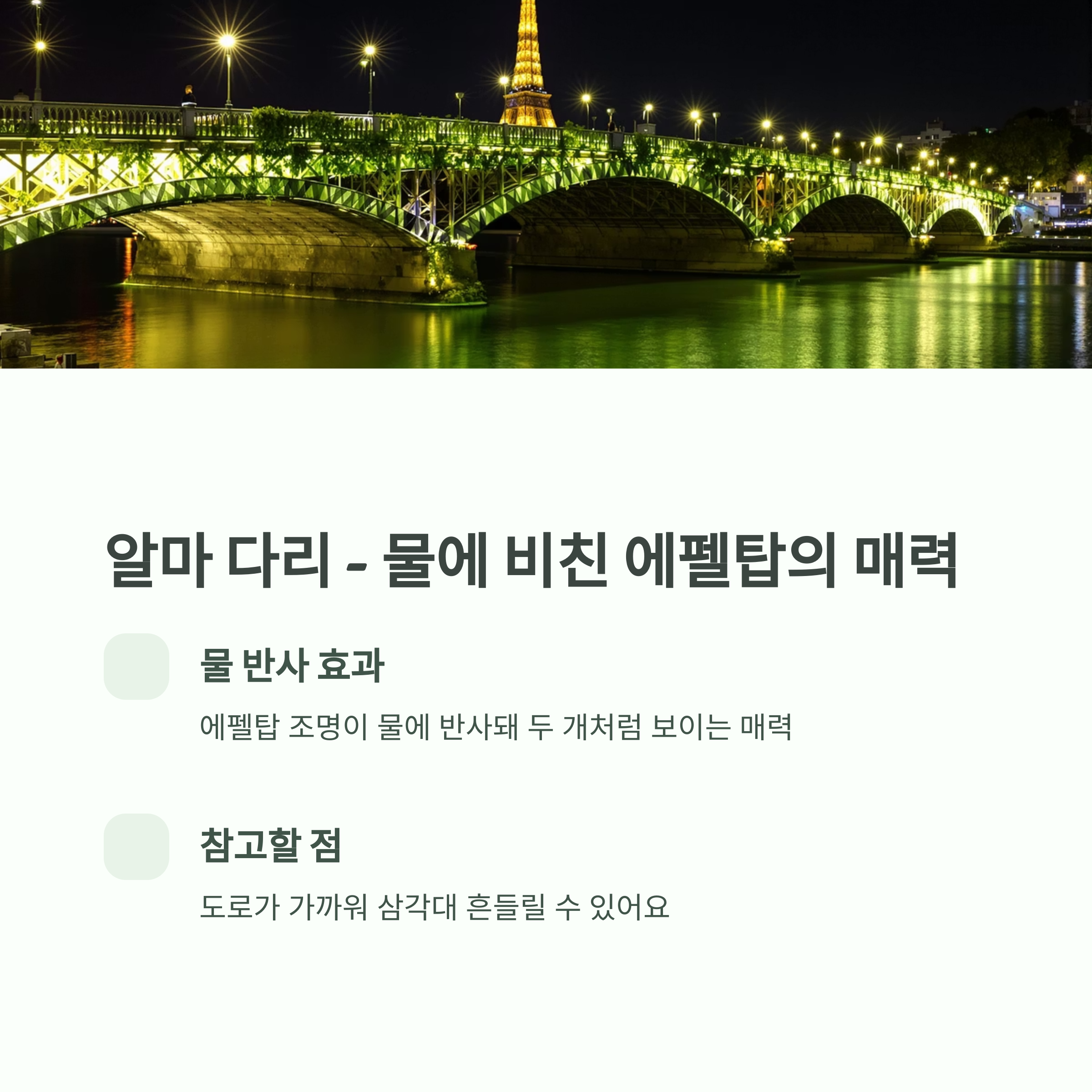 트로카데로처럼 정석 뷰도 좋고, 알마 다리 같은 감성 포인트도 충분히 매력적이에요.