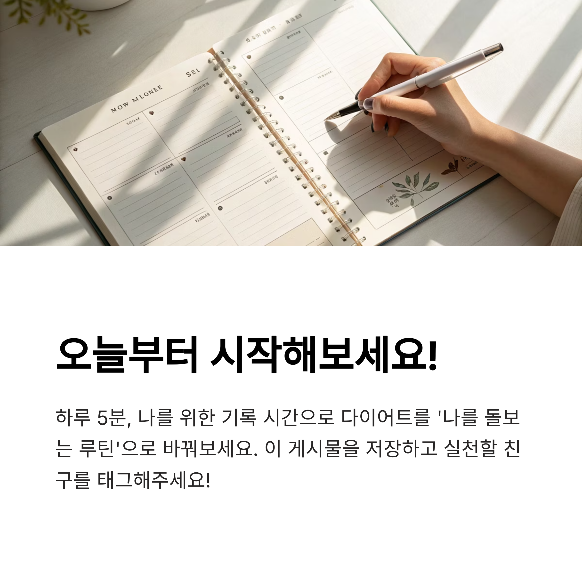다이어트는 절제가 아니라, ‘나를 돌보는 방식’이 될 수 있어요. 잘 먹고, 조금씩 움직이고, 하루를 돌아보며 스스로를 칭찬하는 습관. 플래너는 그걸 기록하는 작은 도구일 뿐이지만 거기 담긴 마음은 점점 삶을 바꿔갑니다. 오늘의 식사도, 감정도, 걸음도 당신의 몸과 마음을 지켜주는 루틴이에요.