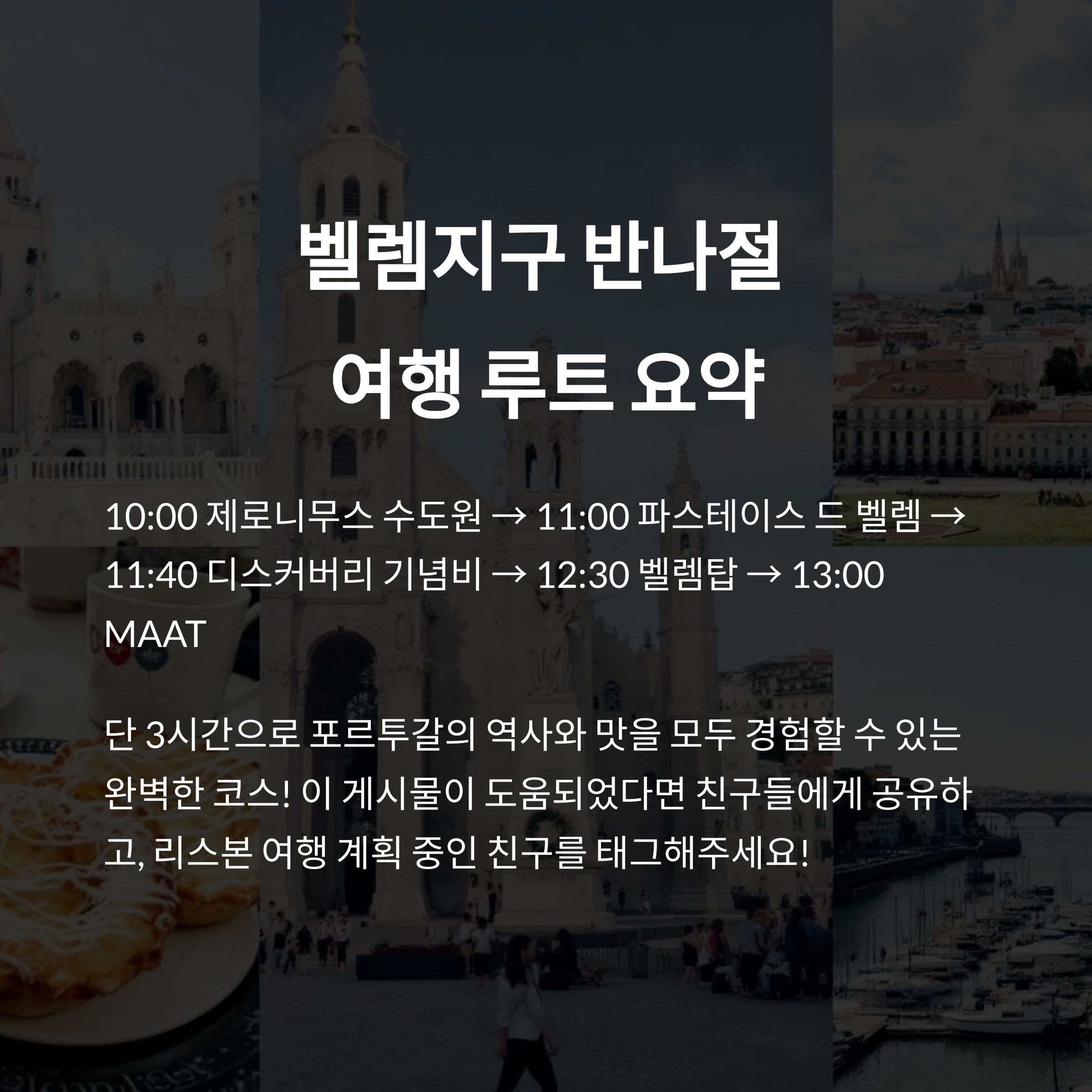 이번 글에서는 리스본 벨렘지구의 반나절 여행 코스를 동선 중심으로 소개합니다.